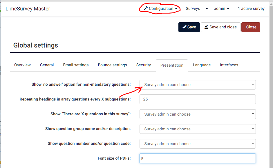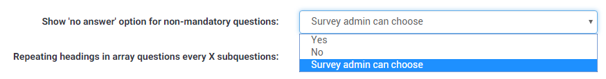 I'm currently programming a survey in version 2.5. Does anyone have a clue how I can deactivate "no answer"? I want all answer to be mandatory and not to have "no answer" included in the survey. In the navigation and presentation tab I should normally be able to deactivate it but there is no drop down menu and I can't change the information the field contains. I receive the following error message: "on (forced by the system administrator)".Enclosed you'll find a screenshot of the issue.