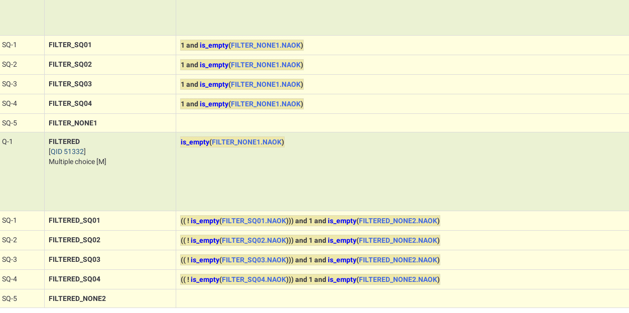 Q2 is filtered by answers given in Q1, but I'd like to see option 'none' in both questions. When I simply add Q1 in array filter for Q2, and respondent will choose AAA, then I canlt see 'none' response in Q2 while it should be visible regardless Q1 selection.