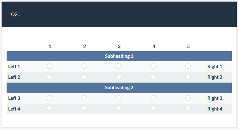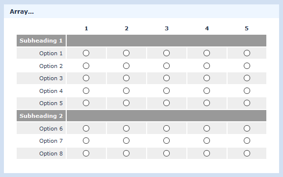 <script type="text/javascript" charset="utf-8"> $(document).ready(function() { // Identify this question var thisQuestion = $('#question{QID}'); // Define the sub-heading text strings var subHeading1 = 'Subheading 1'; var subHeading2 = 'Subheading 2'; var columnsLength = $('tr.answers-list:eq(0) > *', thisQuestion).length; // Insert the new rows $('tr.answers-list:eq(0)', thisQuestion).before('<tr class="sub-header-row"><th colspan="'+columnsLength+'">'+subHeading1+'</th></tr>'); $('tr.answers-list:eq(2)', thisQuestion).before('<tr class="sub-header-row"><th colspan="'+columnsLength+'">'+subHeading2+'</th></tr>'); // Fix up the row classes var rowClass = 1; $('table.subquestions-list tbody tr', thisQuestion).each(function(i) { if($(this).hasClass('sub-header-row')) { rowClass = 1 } else { rowClass++; $(this).removeClass('array1 array2') if(rowClass % 2 == 0) { $(this).addClass('array2'); } else { $(this).addClass('array1'); } } }); }); </script>