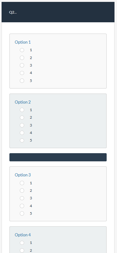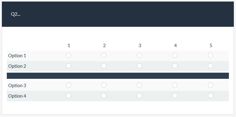 <script type="text/javascript" charset="utf-8"> $(document).ready(function(){ var thisQuestion = $('#question{QID}'); //Insert new style rules var newStyle = '<style type="text/css">\ .inserted-spacer-row {\ border-top: 5px solid #FFFFFF;\ border-bottom: 5px solid #FFFFFF;\ background-color: #2C3E50;\ }\ .inserted-spacer-row td {\ padding: 10px !important;\ }\ @media only screen and (max-width: 801px) {\ .inserted-spacer-row {\ margin-bottom: 20px;\ padding: 0 !important;\ border: 1px solid #2C3E50 !important;\ border-radius: 4px;\ }\ }\ </style>'; $("head link[rel='stylesheet']").last().after(newStyle); // Define a spacer row var numCells = $('tr.radio-list:eq(0) > *', thisQuestion).length; var insertedRow = '<tr class="inserted-spacer-row">\ <td colspan="'+numCells+'"></td>\ </tr>'; // Insert a spacer row $(insertedRow).insertBefore('tr.radio-list:eq(2)', thisQuestion); }); </script>