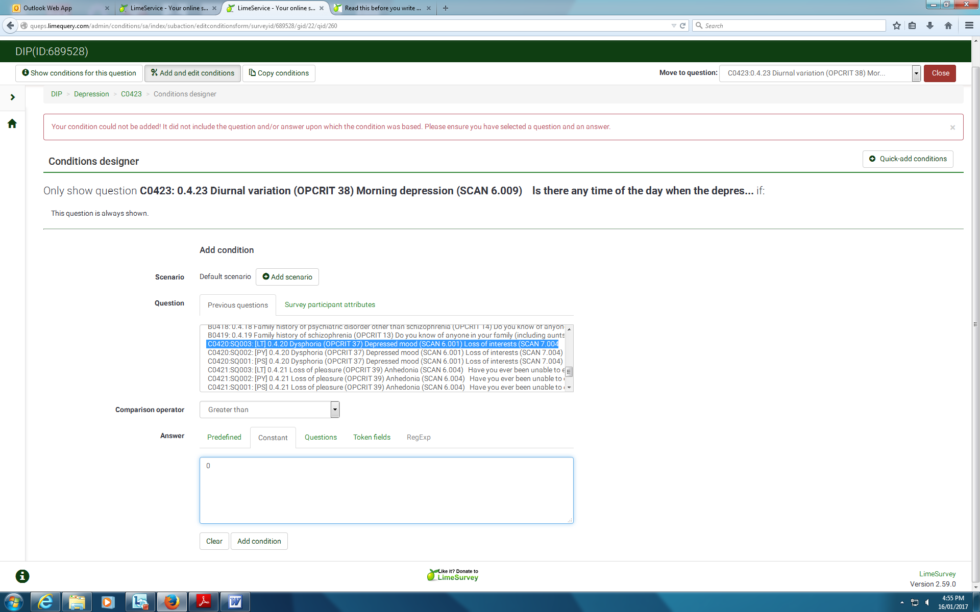 When I select the tested value (i.e. the relevant sub-question), select the comparison operator (i.e greater than) and set the comparison value (i.e constant value "0") I get the error message "Your condition could not be added! It did not include the question and/or answer upon which the condition was based. Please ensure you have selected a question and an answer."
