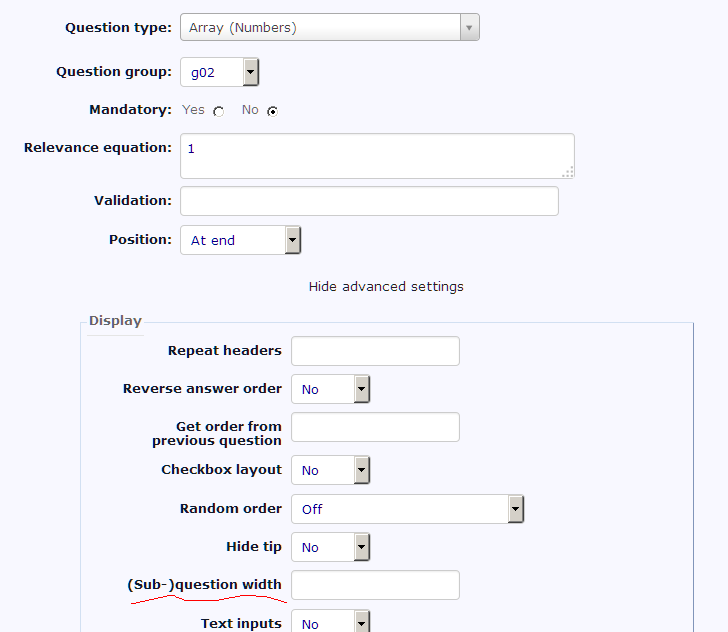 Well, please send a screenshot from your settings. Isn't something like this "subquestion width" there?letty wrote: I am using 2.05 version. I don't find such field under advanced setting.