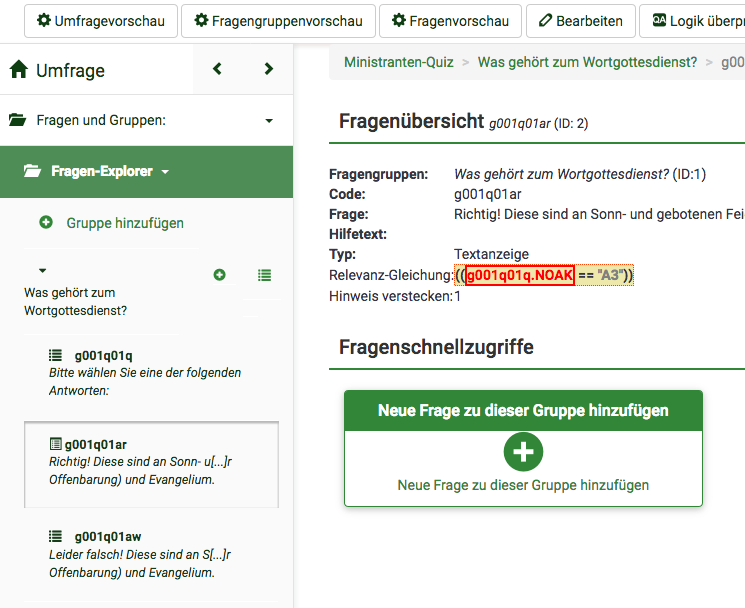 i have the following problem: when i import a survey into limesurvey i can't get the relevance eqations to work. it just tells me thats it's an undefined variable. as you can see in the screenshot below the variable provided is the same as the code for the question i'm refering to. the format shouldn't be an issue since i originally exported a working survey from the system and just edited the actual content for the questions. (editing the equation in the backend does work tho but i can't see any difference to the imported one.)