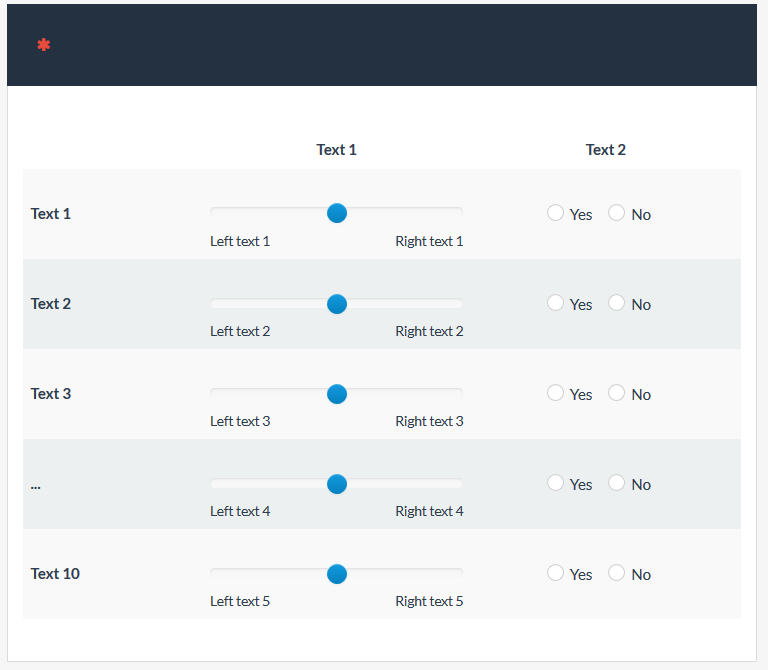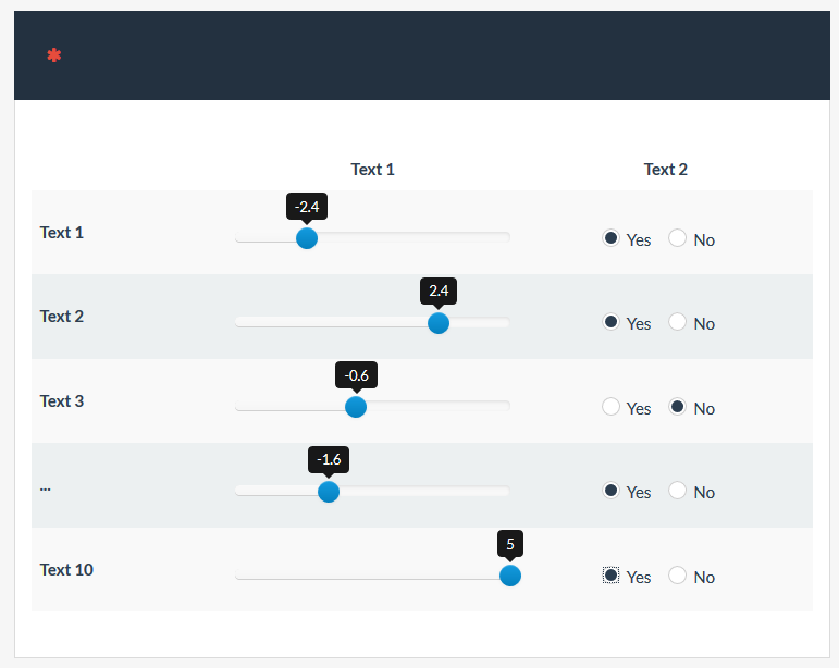 <script type="text/javascript" charset="utf-8"> $(document).ready(function(){ // Identify this question var thisQuestion = $('#question{QID}'); // Assign column-specific classes $('table.subquestion-list tr', thisQuestion).each(function(i) { $('> *:gt(0)', this).each(function(i){ $(this).addClass('column-'+(i+1)); $(this).attr('data-column', i+1); }); }); // Insert the sliders $('.answer-item.column-1 input[type="text"]', thisQuestion).each(function(i) { $(this).closest('td').addClass('with-slider'); var thisValue = $(this).val(); $(this).bootstrapSlider({ 'min': -5, 'max': 5, 'step': 0.1, 'range': false, 'value': Number(thisValue), 'tooltip': 'always' }); // Initialization stuff if(thisValue == '') { $(this).val(''); $(this).closest('td').find('.tooltip').hide(); } else { updateCallOut($(this).closest('td')); } }); // A function to update the slider callout function updateCallOut(el) { var thisTooltip = $(el).find('.tooltip'); //$('.tooltip-inner', thisTooltip).text(callOutText); thisTooltip.show().css('margin-left', '-'+(thisTooltip.width()/2)+'px'); } // Listener on sliders $('td.with-slider .slider').on('mousedown', function(event, ui) { updateCallOut($(this).closest('td')); }); $('td.with-slider input[type="text"]', thisQuestion).on('slide slideStop', function(event, ui) { updateCallOut($(this).closest('td')); checkconditions($(this).val(), $(this).attr('name'), 'text'); }); // Listener on resizing (override the bootstrap callout behaviour) $(window).resize(function() { $('td.with-slider', thisQuestion).each(function(i) { if($('input[type="text"]', this).val() != '') { updateCallOut(this); } }); }); // Insert slider left/right text var leftText = 'Left text'; var rightText = 'Right text'; $('td.with-slider', thisQuestion).append('<div class="left-text">'+leftText+'</div><div class="right-text">'+rightText+'</div>'); // Some clean-up styles for the sliders (could be placed in template.css) $('thead th, .answer-item.column-1', thisQuestion).css({ 'text-align': 'center' }); $('.slider.slider-horizontal', thisQuestion).css({ 'margin': '1.7em auto 1em' }); $('.slider-selection', thisQuestion).css({ 'background': 'transparent none', 'box-shadow': 'none' }); $('.slider-handle', thisQuestion).css({ 'top': '-4px' }); $('.left-text, .right-text', thisQuestion).css({ 'margin-top': '-0.5em', 'font-size': '90%' }); $('.left-text', thisQuestion).css({ 'float': 'left' }); $('.right-text', thisQuestion).css({ 'float': 'right' }); // Hide the text inputs in columns 2 $('.column-2 input[type="text"]', thisQuestion).hide(); // Loop through all column-2 inputs $('.answer-item.column-2 input[type="text"]', thisQuestion).each(function(i) { var thisID = $(this).attr('id'); var thisValue = $(this).val(); // Insert the radios $(this).parent().addClass('radio').append('<span class="inserted-radio-wrapper">\ <input id="'+thisID+'-Y" class="radio" value="Y" name="'+thisID.replace(/answer/, '')+'_radio" type="radio">\ <label class="control-label radio-label" for="'+thisID+'-Y">Yes</label>\ </span>\ <span class="inserted-radio-wrapper">\ <input id="'+thisID+'-N" class="radio" value="N" name="'+thisID.replace(/answer/, '')+'_radio" type="radio">\ <label class="control-label radio-label" for="'+thisID+'-N">No</label>\ </span>'); // Initial radio states $(this).closest('td').find('input[type="radio"][value="'+thisValue+'"]').prop('checked', true); }); // Listener on the radios $('.answer-item.column-2 input[type="radio"]', thisQuestion).on('click', function() { var thisInput = $(this).closest('td').find('input[type="text"]'); $(this).closest('td').find('input[type="text"]').val($(this).val()); checkconditions($(thisInput).val(), $(thisInput).attr('name'), 'text'); }); // Some clean-up styles for the radios (could be placed in template.css) $('thead th, .answer-item.column-2', thisQuestion).css({ 'text-align': 'center' }); $('.answer-item.column-2 .inserted-radio-wrapper', thisQuestion).css({ 'display': 'inline-block', 'margin': '25px 10px 0 20px' }); $('.answer-item.column-2 label', thisQuestion).css({ 'padding': '0' }); $('.answer-item.column-2 .radio-label', thisQuestion).css({ 'padding-left': '3px', 'margin-right': '3px' }); }); </script>