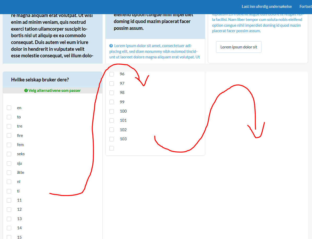 <div id="question145" class="multiple-opt spalter col-xs-12 question-container"> <!-- Question title --> <div class="row question-wrapper question-title-container"> <div class="col-sm-12 questiontext"> <div class="qnumcode question-text"> Hvilke selskap bruker dere? </div> </div> </div> <!-- Question valid message --> <div class="row question-wrapper"> <div class="col-sm-12 questionvalidcontainer"> <div class="text-info questionhelp " role="alert" id="vmsg_145" > <div id='vmsg_145_default' class='em_default emtip '> <span class='fa fa-exclamation-circle' aria-hidden="true"></span> Velg alternativene som passer</div> </div> </div> </div> <!-- Question help --> <div class="row question-wrapper question-help-container"> <div class="col-sm-12 question-help"> </div> </div> <!-- Answer --> <div class="row question-wrapper answer-container"> <div class="col-sm-12 answer"> <!-- Multiple Choice --> <!-- answer --> <div class="row multiple-choice-container subquestion-list questions-list checkbox-list"> <input type="hidden" name="MULTI975185X7X145" value="105" /> <!-- answer_row --> <div class="col-sm-12"> <div id='javatbd975185X7X145SQ1' class='question-item answer-item checkbox-item form-group checkbox' > <input class="checkbox" type="checkbox" name="975185X7X145SQ1" id="answer975185X7X145SQ1" value="Y" onclick='cancelBubbleThis(event); checkconditions(this.value, this.name, this.type)' aria-labelledby="label-answer975185X7X145SQ1" /> <label for="answer975185X7X145SQ1" class="answertext"></label> <!-- The label text is provided inside a div, so final user can add paragraph, div, or whatever he wants in the subquestion text This field is related to the input thanks to attribute aria-labelledby --> <div class="label-text label-clickable" id="label-answer975185X7X145SQ1"> en </div> <input type="hidden" name="java975185X7X145SQ1" id="java975185X7X145SQ1" value="" /> </div> </div> <!-- end of answer_row --> <!-- answer_row --> <div class="col-sm-12"> <div id='javatbd975185X7X145SQ2' class='question-item answer-item checkbox-item form-group checkbox' > <input class="checkbox" type="checkbox" name="975185X7X145SQ2" id="answer975185X7X145SQ2" value="Y" onclick='cancelBubbleThis(event); checkconditions(this.value, this.name, this.type)' aria-labelledby="label-answer975185X7X145SQ2" /> <label for="answer975185X7X145SQ2" class="answertext"></label> <!-- The label text is provided inside a div, so final user can add paragraph, div, or whatever he wants in the subquestion text This field is related to the input thanks to attribute aria-labelledby --> <div class="label-text label-clickable" id="label-answer975185X7X145SQ2"> to </div> <input type="hidden" name="java975185X7X145SQ2" id="java975185X7X145SQ2" value="" /> </div> </div> <!-- end of answer_row -->