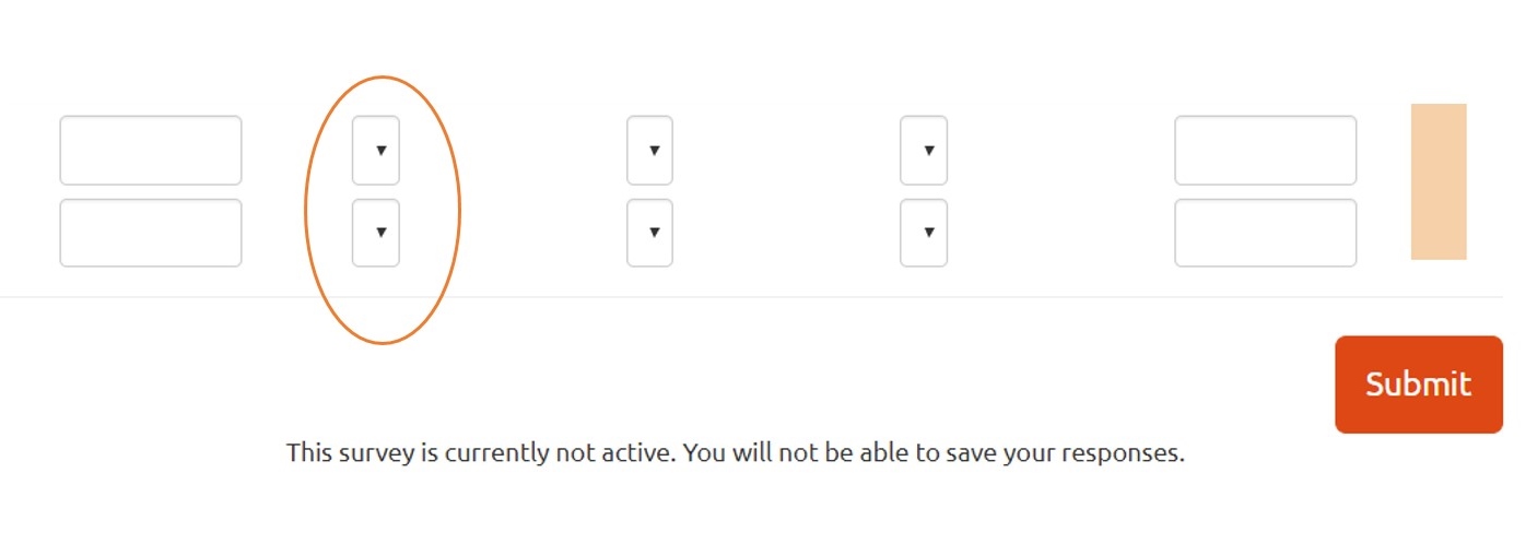 <p style="line-height: 20px; text-align: center;"><span style="font-size:11px;">Project ID(s), number or code(s)</span> <script type="text/javascript" charset="utf-8"> $(document).ready(function() { // Call the "sideBySide" function with number of rows, columns and start position sideBySide(3, 5, 1); }); function sideBySide(rows, columns, startQuestion) { /*********** Display multiple questions side by side ***********/ if ($('div.qRow1').length == 0) { var rowNum = 0; var colNum = 1; var rowList = new Array(); //////// Add question classes for later use //////// // Loop through all questions and add row and column specific classes $('div[id^="question"]').each(function(i) { if(i >= (startQuestion-1) && rowNum < rows) { // This IF condition only needed if there are questions before or following the "inline" questions $(this).addClass('qRow'+rowNum+'').addClass('qCol'+colNum+'').addClass('inlineQuestion'); if(rowNum == 0 && colNum > 1) { $(this).addClass('columnLabel'); } if(rowNum > 0 && colNum == 1) { $(this).addClass('rowLabel'); } else if(rowNum > 0 && colNum > 1) { $(this).addClass('questionCell'); } if(colNum == columns) { rowList.push('qRow'+rowNum+''); rowNum++; colNum = 1; } else { colNum++; } } else { $(this).addClass('normalQuestion'); } }); //////// Survey layout manipulation //////// // Fix the width of the survey $('table.outerframe').css({ 'width': '800px' }); // Wrap each "row" in a wrapper div $(rowList).each(function(i) { $('.'+this+'').wrapAll('<div id="inlineWrapper'+i+'" class="inlineRow" />'); }); // Style the wrapper divs $('.inlineRow').css({ 'width': '800px', 'height': '45px', 'background-color':'#F5D0A9', 'margin': '0 auto 0 auto', 'clear': 'both' }); $( '.inlineRow:first' ).css({ 'margin-top': '5px' }); // Get all the questions to sit politely side by side $( '.inlineQuestion' ).css({ 'float': 'left', 'height':'30px', 'overflow':'visible', 'margin-bottom': '0px' }); $( '.inlineQuestion .questionhelp' ).hide(); $( '.inlineQuestion .survey-question-help' ).parent().hide(); // A little space under the last row $( '.inlineRow:last .inlineQuestion' ).css({ 'margin-bottom': '10px' }); // Any questions not displayed inline (this is only needed if there are questions following the "inline" questions) $( '.normalQuestion' ).css({ 'clear': 'both' }); //////// Column manipulation //////// // Set the column widths - can be set individually if necessary // Must add up to less than 100% $( '.qCol1' ).css({ 'width': '20%' }); $( '.qCol2' ).css({ 'width': '20%' }); $( '.qCol3, .qCol4, .qCol5' ).css({ 'width': '20%' }); //////// Question manipulation //////// // Hide the answer element in boilerplate questions $( 'div.boilerplate td.answer' ).parent().hide(); // Hide the question text elements in non-boilerplate questions $('div.questionCell td.questiontext').parent().hide(); // Push the question tables to 100% $( 'div.inlineRow table' ).css({ 'width': '100%' }); // Get everything to line up nicely vertically $( '.inlineQuestion td.questiontext, .inlineQuestion td.answer p' ).css({ 'text-align': 'center' }); // Adjust cell heights so everything lines up nicely horizontally $( '.inlineQuestion td.answer, .inlineQuestion td.questiontext' ).css({ 'height':'35px', 'overflow':'visible', 'padding':'0.5em' }); $( '#inlineWrapper0 .inlineQuestion' ).css({ 'height':'35px' }); $( '#inlineWrapper0 td.questiontext' ).css({ 'height':'35px' }); // Yes-no question styles $( 'div.yes-no ul' ).css({ 'text-align': 'center', 'font-size': '90%', 'margin': '0', 'padding-bottom': '5px' }); $( 'div.yes-no li' ).css({ 'padding-right': '1.5em' }); $( 'div.yes-no td.answer' ).css({ 'padding-bottom': '0' }); // Yxxxxxx question styles $( 'div.list-dropdown' ).css({ 'width' : '150px' }); // Short-text question styles $( 'div.text-short input' ).css({ 'width': '100px', 'margin': '0' }); // Numeric question styles $( 'div.numeric input' ).css({ 'width': '125px', 'margin-left': '0' }); $( 'div.numeric p.tip' ).css({ 'display': 'none' }); // Get rid of the margins around select boxes $( 'p.question' ).css({ 'margin':'0' }); } } </script></p>