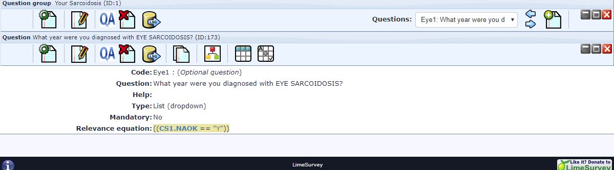 I am trying to set a simple condition for a question (Eye1) so that it is shown only when the answer to another question in the same group (YS1) is 'Eye' (4). The condition seems to be defaulting to another question in the same group (CS1) instead of (YS1). Screenshot1 shows how the condition is INCORRECT in the question view and screenshot2 shows the same condition CORRECT in the conditions view.