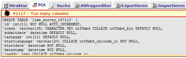 The activation error message states that the response table cannot be created correctly. So I would conclude that you cannot inspect a table inside the database which hits the limits.shiva522 wrote: from which it can be concluded that limesurvey itself limits the number of acceptable questions in polls.