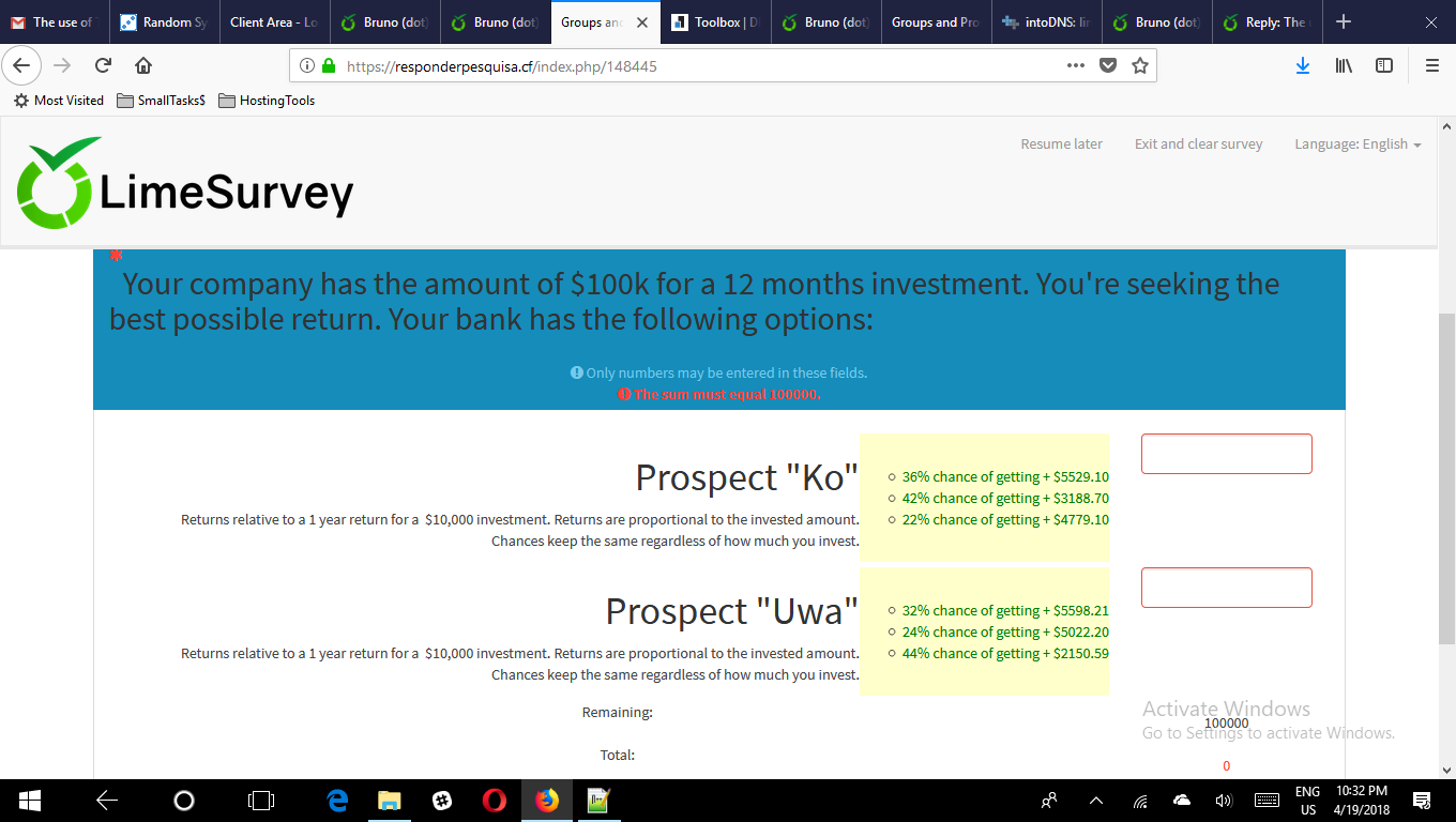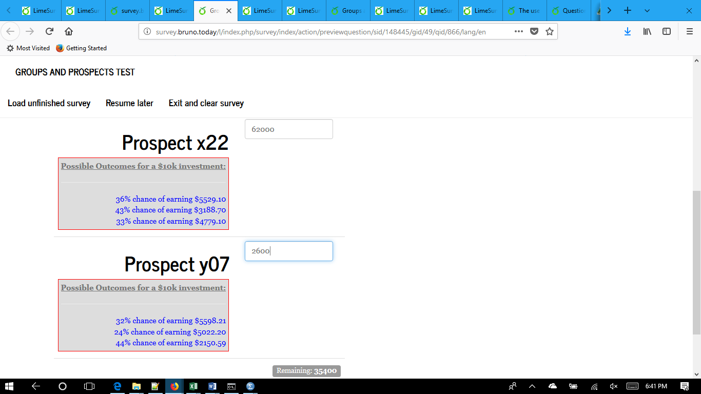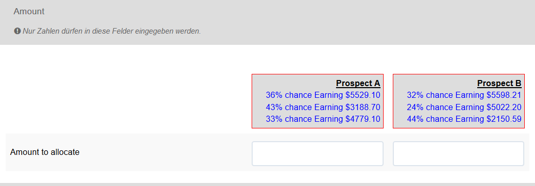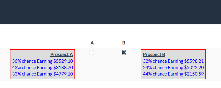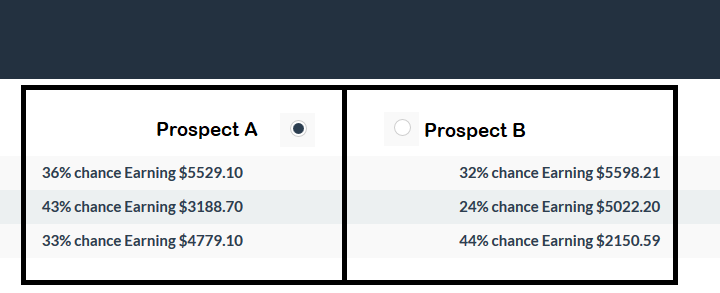 <div style="float:right;border:1px solid red;padding:5px;background-color:#ddd"><span style="font-weight:bold"><u>Prospect A</u></span><br><span style="color:blue;font-weight:normal">36% chance Earning $5529.10<br>43% chance Earning $3188.70<br>33% chance Earning $4779.10</span></div>|<div style="float:left;border:1px solid red;padding:5px;;background-color:#ddd"><span style="font-weight:bold"><u>Prospect B</u></span><br><span style="color:blue;font-weight:normal">32% chance Earning $5598.21<br>24% chance Earning $5022.20<br>44% chance Earning $2150.59</span></div>