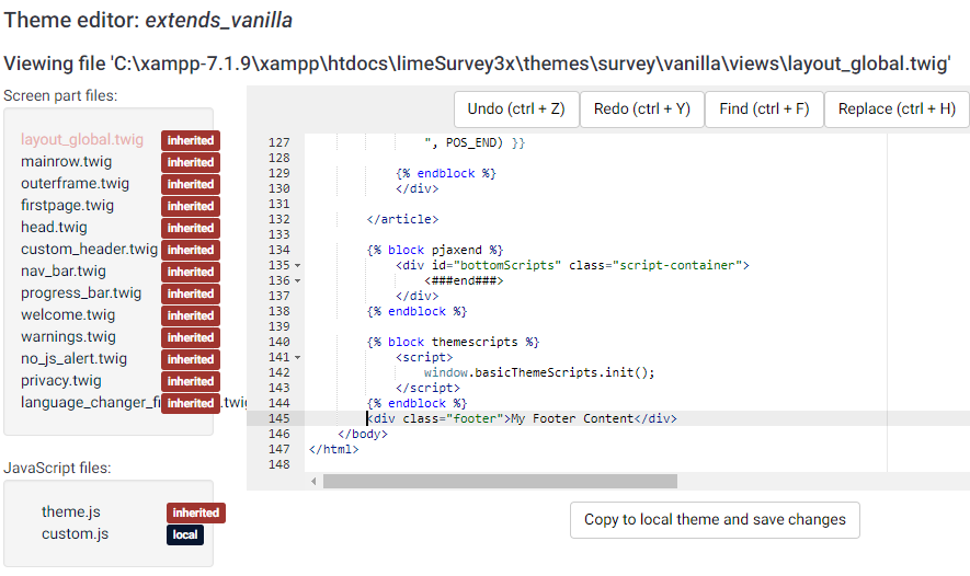 I would like to add a footer to my design template (using an extension of vanilla) containing a link. Version: 3.8.1+180524