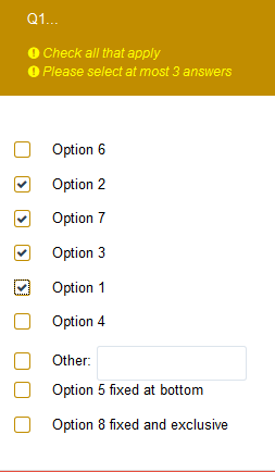 <script type="text/javascript" charset="utf-8"> $(document).ready(function() { // Maximun answers var maxAnswers = 3; // Identify this question var thisQuestion = $('#question{QID}'); function checkMax() { $('input.checkbox', thisQuestion).prop('disabled', false); if($('input.checkbox:checked', thisQuestion).length >= maxAnswers) { $('input.checkbox', thisQuestion).not(':checked').prop('disabled', true); } } // Initial checkbox states checkMax(); // Listener on the checkboxes $('input.checkbox', thisQuestion).change(function(e) { checkMax(); }); // Remove any "disabled" properties before submitting $('#movenextbtn, #movesubmitbtn').bind('click', function () { $('input.checkbox', thisQuestion).prop('disabled', false); }); }); </script>