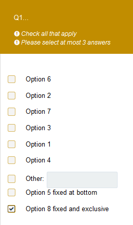 <script type="text/javascript" charset="utf-8"> $(document).ready(function() { // Identify this question var qID = {QID}; var thisQuestion = $('#question'+qID); // Define the sub-question codes to be placed last var lastItems = [ 'SQ005','SQ008']; // Loop through those sub-question codes $.each(lastItems, function(i, val) { // Move that item to the end of the list // Multi-choice question if($(thisQuestion).hasClass('multiple-opt')) { $('.question-item[id$=X'+qID+val+']', thisQuestion).parent().appendTo($('.subquestion-list', thisQuestion)); } // Array question if($(thisQuestion).hasClass('array-flexible-row')) { $('.answers-list[id$=X'+qID+val+']', thisQuestion).appendTo($('table.subquestion-list', thisQuestion)); } }); }); </script> <script type="text/javascript" charset="utf-8"> $(document).ready(function(){ // Identify this question var thisQuestion = $('#question{QID}'); // Uncheck all excluded items $('div.question-item:last input.checkbox', thisQuestion).on('change', function(e) { if($(this).is(':checked')) { $('input.checkbox', thisQuestion).not($(this)).each(function(i) { $(this).prop('checked', false); $(this).nextAll('input:hidden:eq(0)').attr('value', ''); }); } }); }); </script>