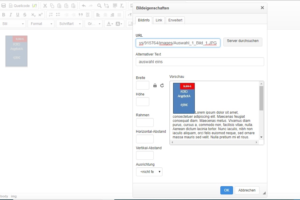 Now I have uploaded a picture into the local server with a local URL and also tried to upload a picture from an external URL. Both times the upload works, but on the screen the picture is not right, see screenshots. Is there something wrong with the settings I chose? One time it worked out and the picture appeared on the screen, but still there was a big frame around it and some code written around it, though i chose exactly the same settings.
