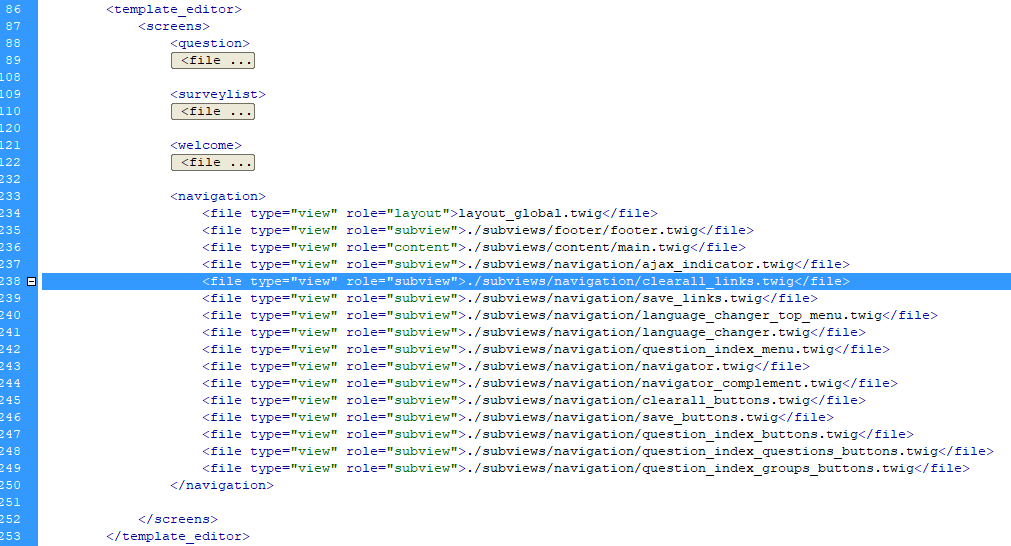 I copied the file ./subviews/navigation/clearall_links.twig to /upload/themes/survey/yourThemeName/views/subviews/navigation/, but the file is not shown in template editor. I had to create the folder navigation/ manually.