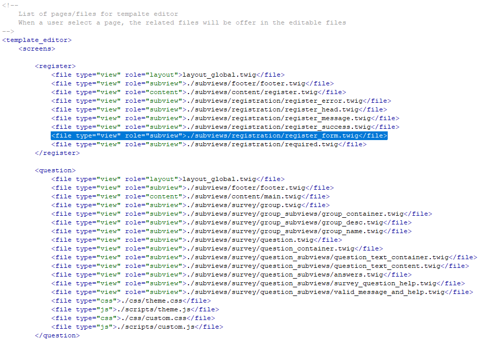 I'm wondering why not all template files (.twig) used by a specific "Screen" are showing up in file control window of the Theme Editor. E.g. "register_form.twig" is used by the "Register" screen but it is not showing up in the file control window.