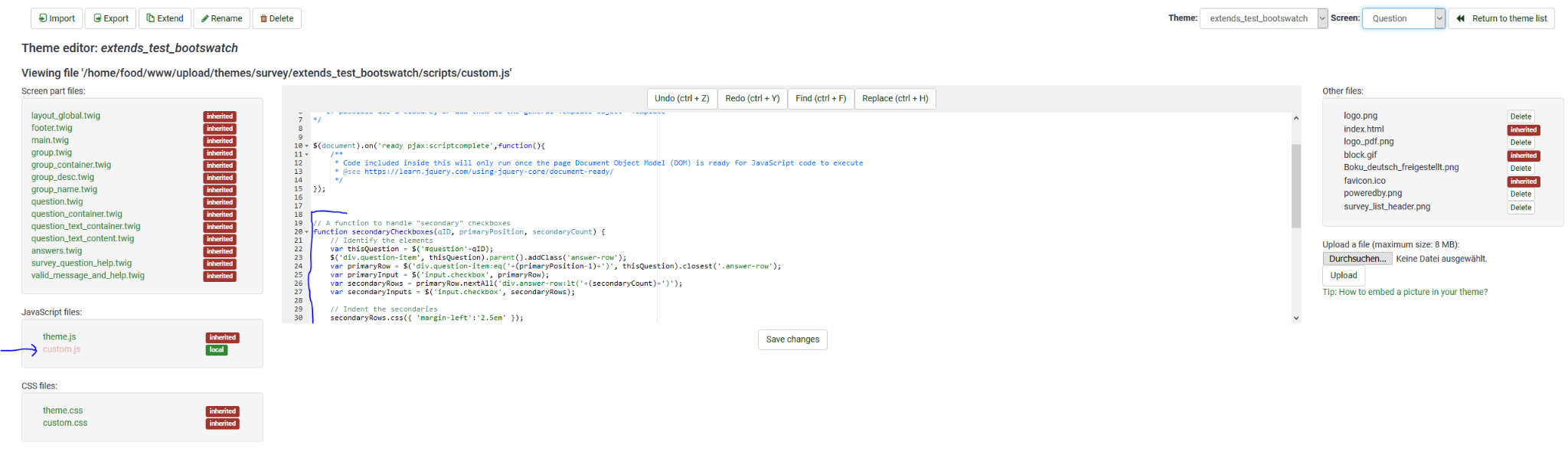 <script type="text/javascript" charset="utf-8"> $(document).on('ready pjax:scriptcomplete',function(){ dependantCheckboxes( {QID}, ['SQ1', 'SQ2'], // First-level sub-question codes ['SQ11', 'SQ12', 'SQ21', 'SQ22'], // Second-level sub-question codes ['SQ111', 'SQ112', 'SQ121', 'SQ122', 'SQ211', 'SQ212', 'SQ213', 'SQ221', 'SQ222'] // Third-level sub-question codes ); }); </script>