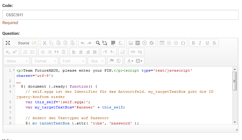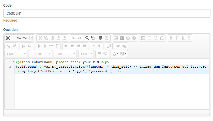 I use a java script to switch the text style to password. It always worked until now. At first the script was completely gone, I pasted it once again, but when I saved and closed the editor parts of the script were missing and it is displayed as plain text.
