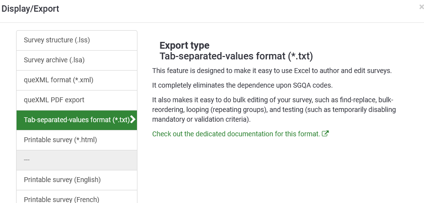 If i don't make error , there are NO specific tool for survey translation ?jelo wrote: There is no special import/export tool for translation (e.g. XML .xlf/XLIFF file format).
