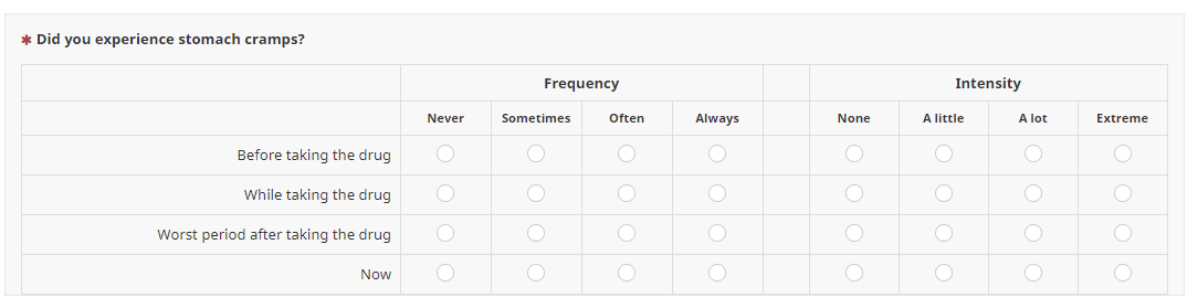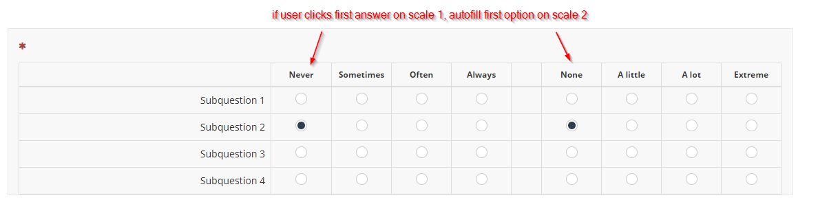 <script type="text/javascript" charset="utf-8"> $(document).on('ready pjax:scriptcomplete',function(){ // Identify this question var thisQuestion = $('#question{QID}'); // Loop through first-row answers $('tr.answers-list:eq(0) input[type="radio"]', thisQuestion).each(function(i) { // Click the fourth column if(i == 4) { var thisName = $(this).attr('name'); if($('input[type="radio"][name="'+thisName+'"]:checked', thisQuestion).length == 0) { $(this).trigger('click'); } } }); }); </script>
