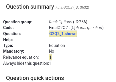 I am running Version 3.15.5+181115. I have a 'ranking' question where respondents select up to three options from a list. I have a follow-on 'ranking' question where they get to pick at most one from what they selected in the first question. I created the answer options for the second question using expressions similar to "{G2Q1_x.shown}".