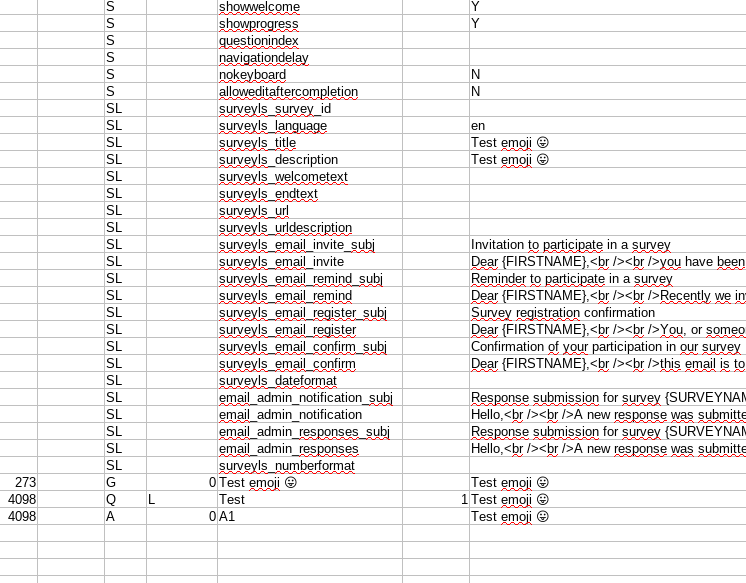 Even tried the following thing now: I imported the manipulated survey with emojis, they're not shown (only ????). They I exported this version again, edited with libre office (replaced ???? with the emoji), imported again to Limesurvey. But still, it's only displayed as ???? again.