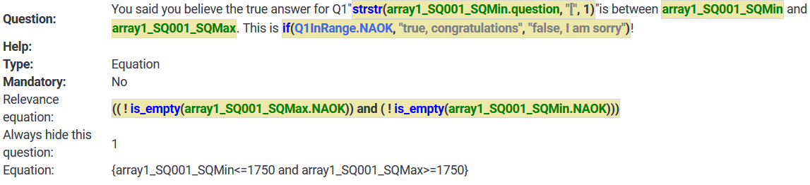 So you believe the true answer for Q3 is between {array1_SQ003_SQMin} and {array1_SQ003_SQMax}? This is {if(((!is_empty(array1_SQ003_SQMax.NAOK)) and (!is_empty(array1_SQ003_SQMin.NAOK))),"true, congratulations","false, I am sorry")}!