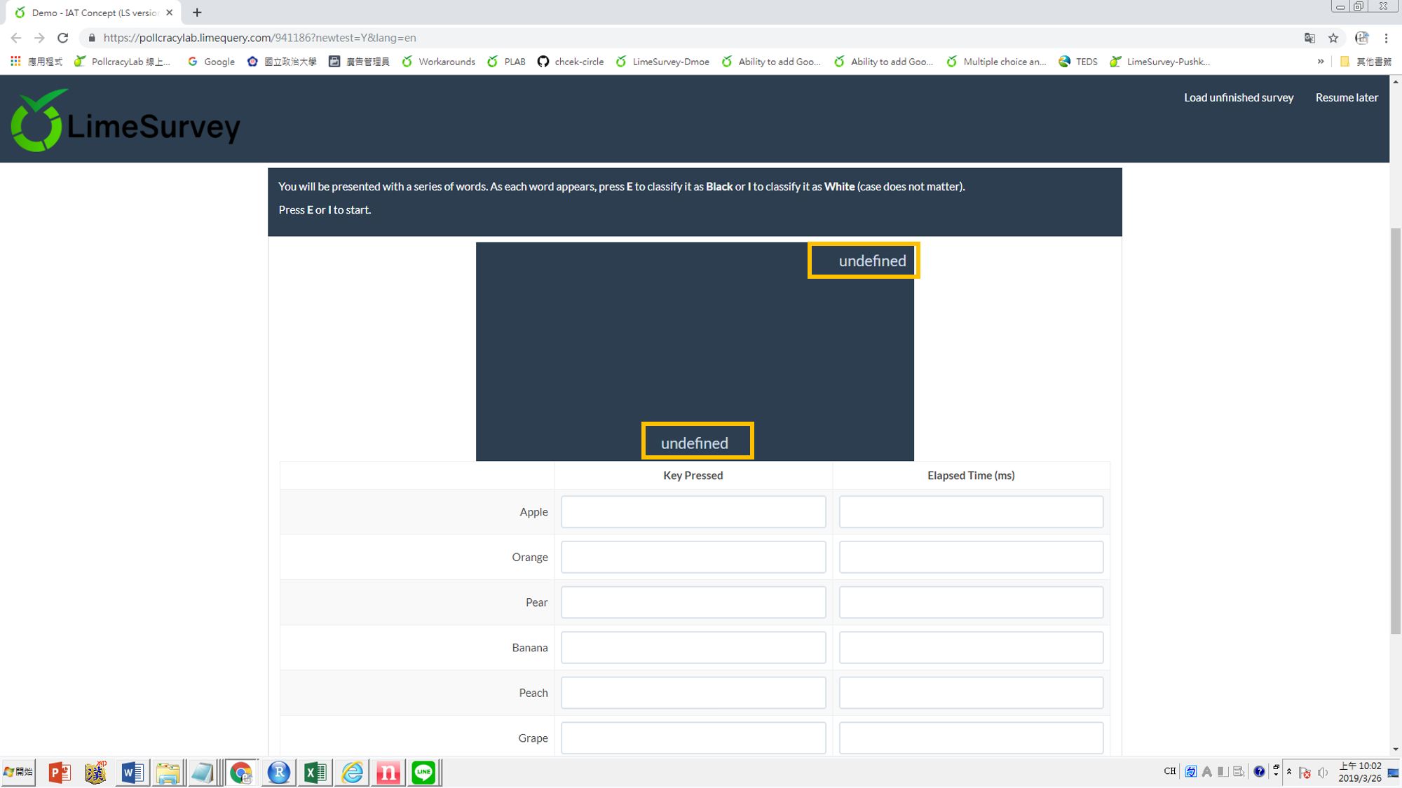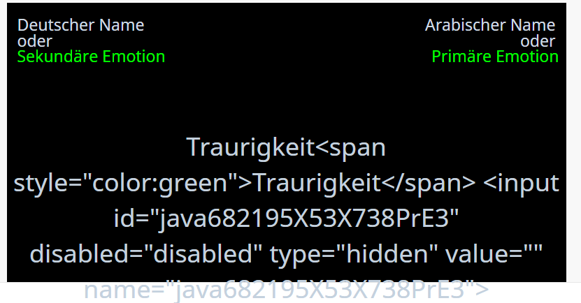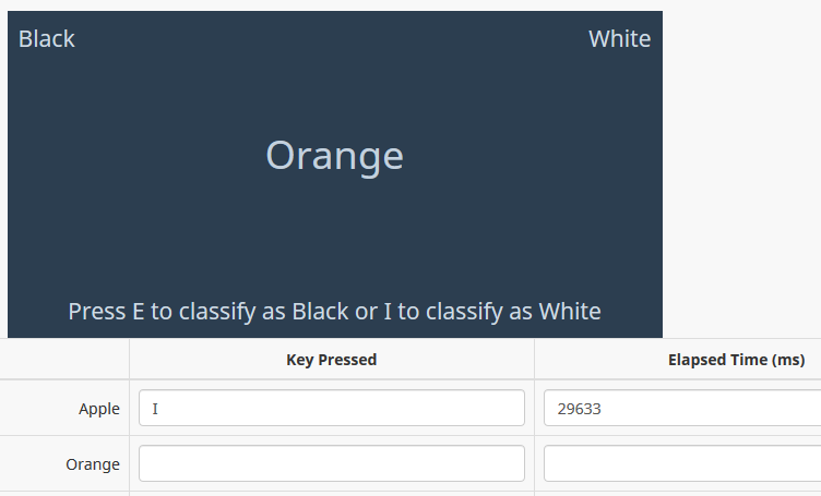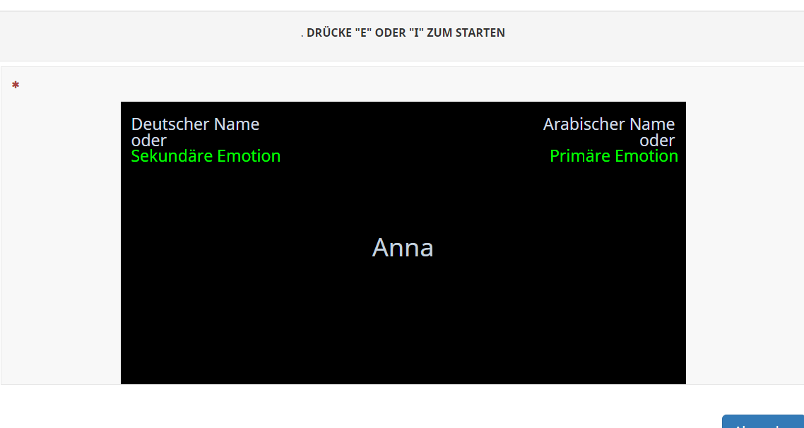 // Insert IAT display var iatTexts = $(thisQuestionHelp).text().split('||'); var iatDisplayHTML = '<div class="iatWrapper2">\ <div class="iatLeftLabel">'+iatTexts[0]+'</div>\ <div class="iatRightLabel">'+iatTexts[1]+'</div>\ <div class="iatWord2"></div>\ <div class="iatInstructions">'+iatTexts[2]+'</div>\ <div class="iatPlusrfarbig">'+iatTexts[3]+'</div>\ <div class="iatPlusl">'+iatTexts[4]+'</div>\ <div class="iatPlus1r">'+iatTexts[5]+'</div>\ <div class="iatPlus1lfarbig">'+iatTexts[6]+'</div>\ </div>\ <div class="iatMobileButtonWrapper">\ <div class="iatButton iatLeftButton">E</div>\ <div class="iatButton iatRightButton">I</div>\ <div style="width:100%; clear:both;"></div>\ </div>'; $(thisQuestionAnswers).prepend(iatDisplayHTML); // Show a word function iatShowWord() { $('div.iatWord2', thisQuestion).text($('tr.subquestion-list.unanswered:first .answertext', thisQuestion).text()); startTime = new Date(); $(document).bind('keypress.iatKeypress', function(e) { if(e.which == 101 || e.which == 105) { var thisRow = $('tr.subquestion-list.unanswered:eq(0)', thisQuestion); $(thisRow).removeClass('unanswered'); endTime = new Date(); $('input[type="text"]:eq(1)', thisRow).val(endTime.valueOf() - startTime.valueOf()); if(e.which == 101) { $('input[type="text"]:eq(0)', thisRow).val('E'); } else { $('input[type="text"]:eq(0)', thisRow).val('I'); } $(document).unbind('keypress.iatKeypress'); if($('tr.subquestion-list.unanswered', thisQuestion).length > 0) { iatShowWord(); } else { $('.iatLeftLabel, .iatWord2, .iatRightLabel, .iatInstructions, .iatPlusrfarbig, .iatPlusl, .iatPlus1r, .iatPlus1lfarbig', thisQuestion).fadeOut('slow', function() { $('div.iatWord2', thisQuestion).text(iatTexts[7]); $('.iatWord2', thisQuestion).addClass('done').fadeIn('slow'); }); } } }); }