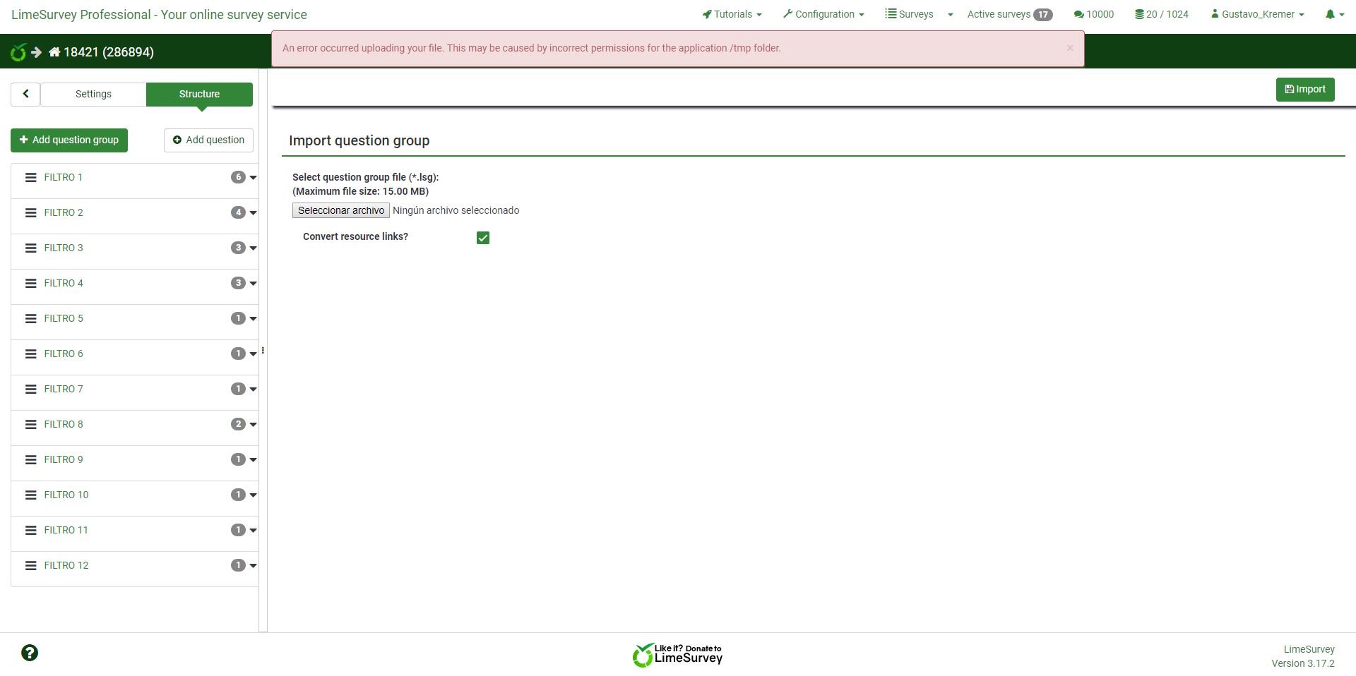 Now I'm trying to import a group from a previous survey into a new one, and i'm getting an error message that says "An error occurred uploading your file. This may be caused by incorrect permissions for the application /tmp folder."
