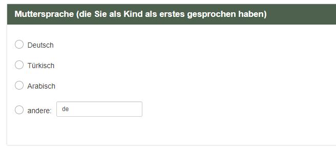 I have a question in my survey asking for the mother tongue of participants. It is a list with three options and I enabled the "other" field. My problem is now that the "other" field is already filled with the letters "de" (see pic attached). I don't know what to do about this problem and haven't found a solution in the forum. I have another list question in the same survey where the problem does not appear. The settings seem the same to me for both questions.