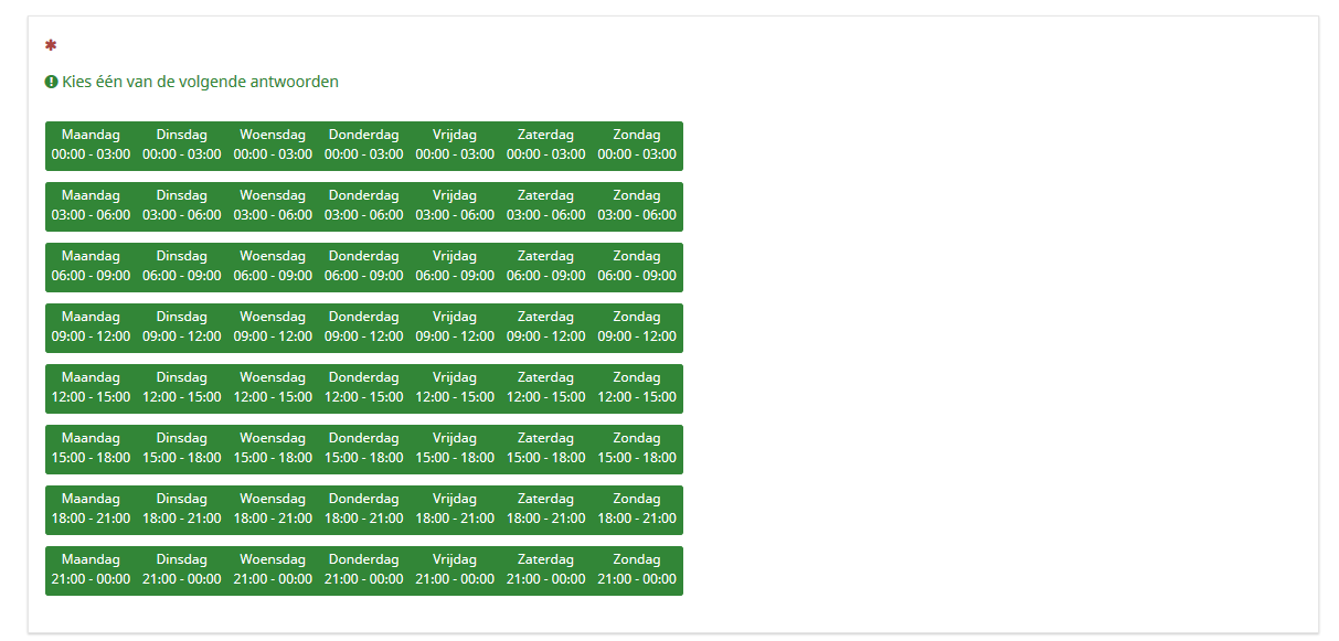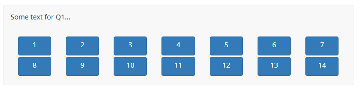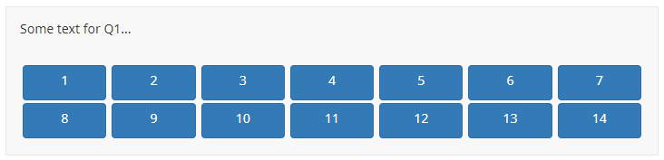 Code:<script type="text/javascript" charset="utf-8"> $(document).on('ready pjax:scriptcomplete',function(){ // Identify this question var thisQuestion = $('#question{QID}'); // "Row" classes $('.bootstrap-buttons-div', thisQuestion).each(function(i) { $(this).addClass('row-'+Math.ceil((i+1)/8)); }); }); </script>
