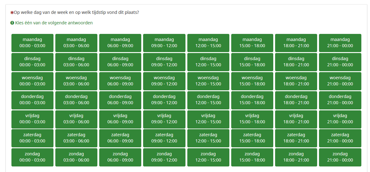Thanks to your helpful feedback, I now have a radio list with bootstrap buttons of 56 categories, divided over 8 colomns (for each 3-hour time slot) and 7 rows (for each day of the week):