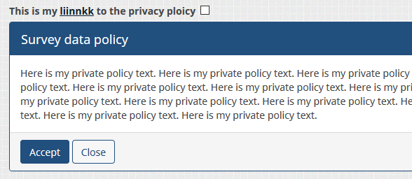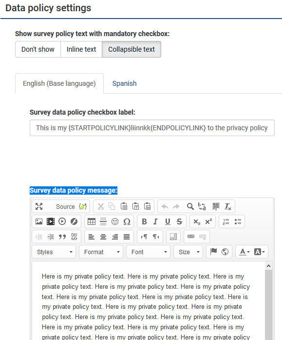 The tags {STARTPOLICYLINK} und {ENDPOLICYLINK} are used to have the text with the link a bit customized.