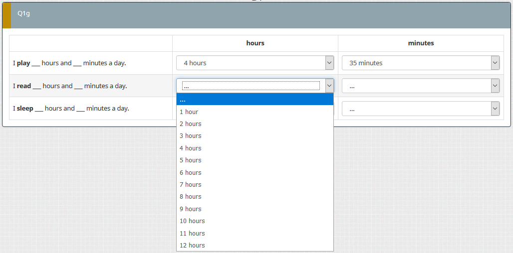I don't want to use up too much space and simply need two questions/fields in one line/row. The result should be a sentence with gaps, which are to be filled by the user, e.g.: I play XXX hours and XXX minutes a day (with XXX being the entry).