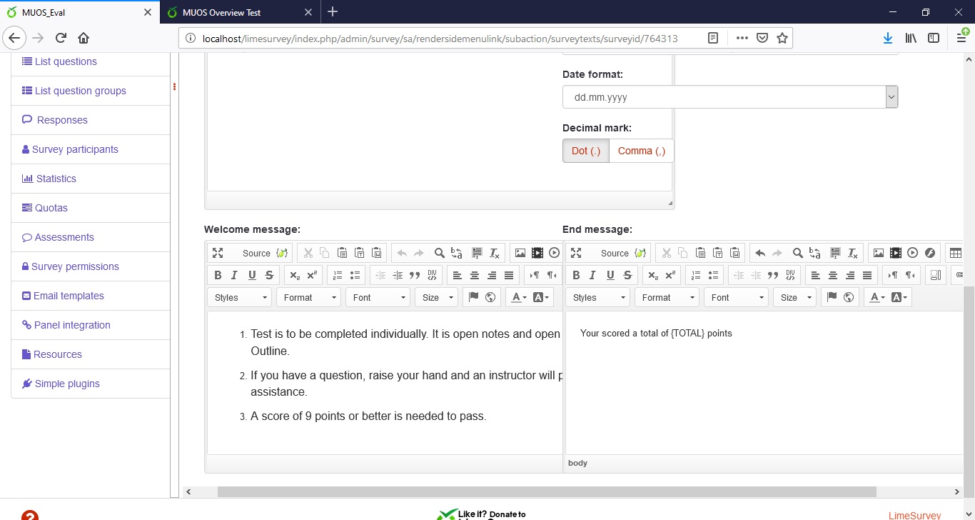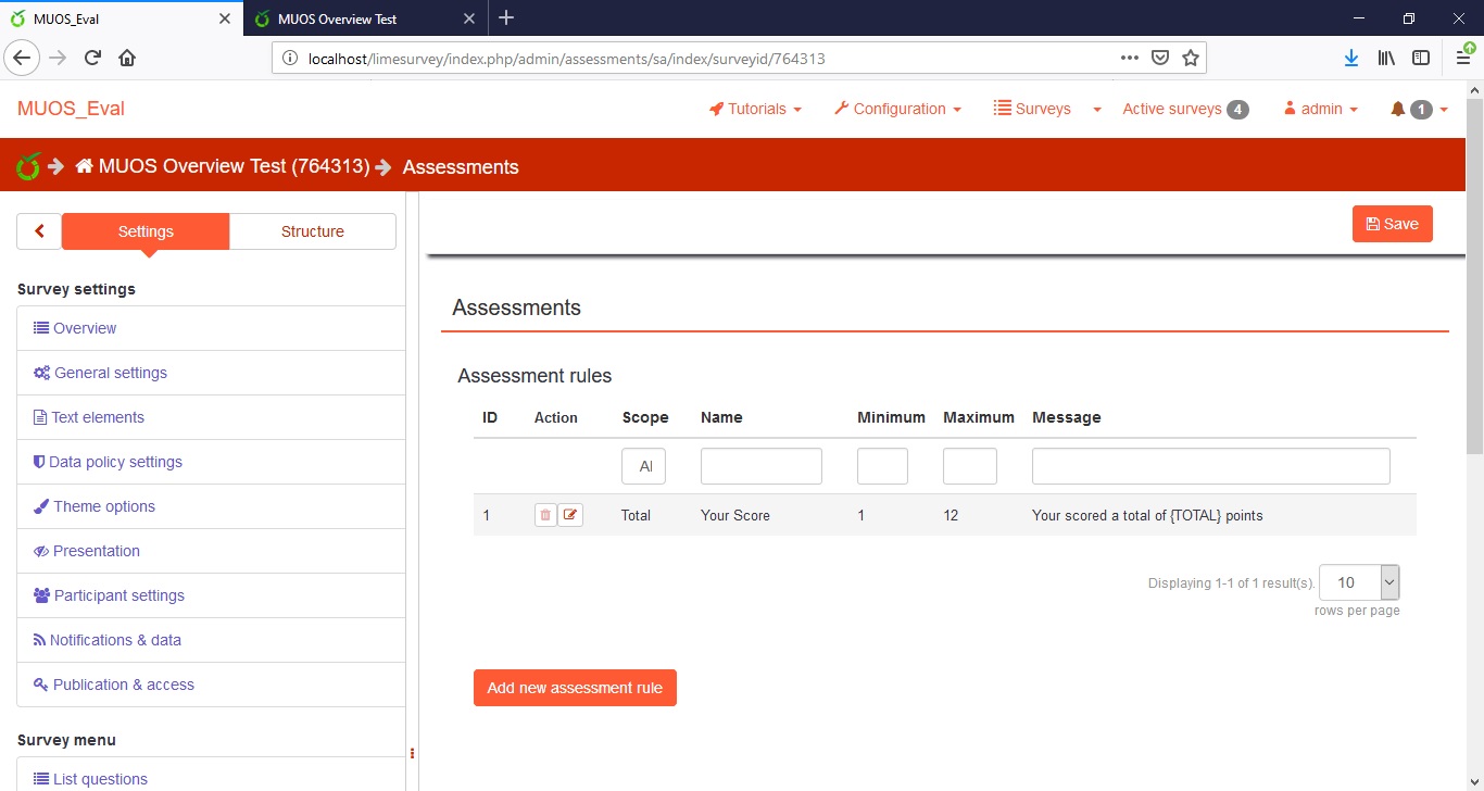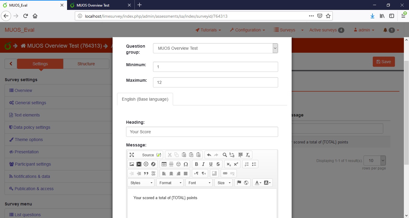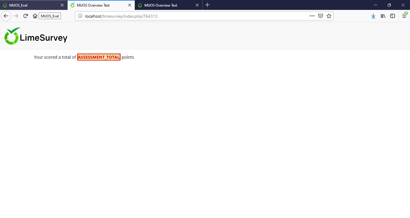 www.limesurvey.org/manual/Assessments{TOTAL}: It displays the total score. It can be used only in the message field of the assessment rule!