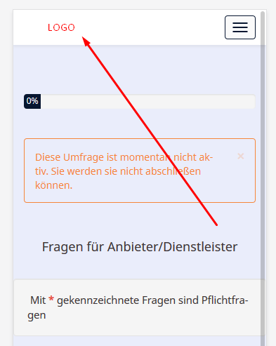 {# Logo option #} {% if( aSurveyInfo.options.brandlogo == "on") %} <div class="{{ aSurveyInfo.class.navbarbrand }} logo-container" {{ aSurveyInfo.attr.navbarbrand }} > {{ image(aSurveyInfo.options.brandlogofile, aSurveyInfo.name, {"class": "logo img-responsive"}) }} </div> {% else %} <div class="{{ aSurveyInfo.class.navbarbrand }}" {{ aSurveyInfo.attr.navbarbrand }} > {{ aSurveyInfo.name }} </div> {% endif %}