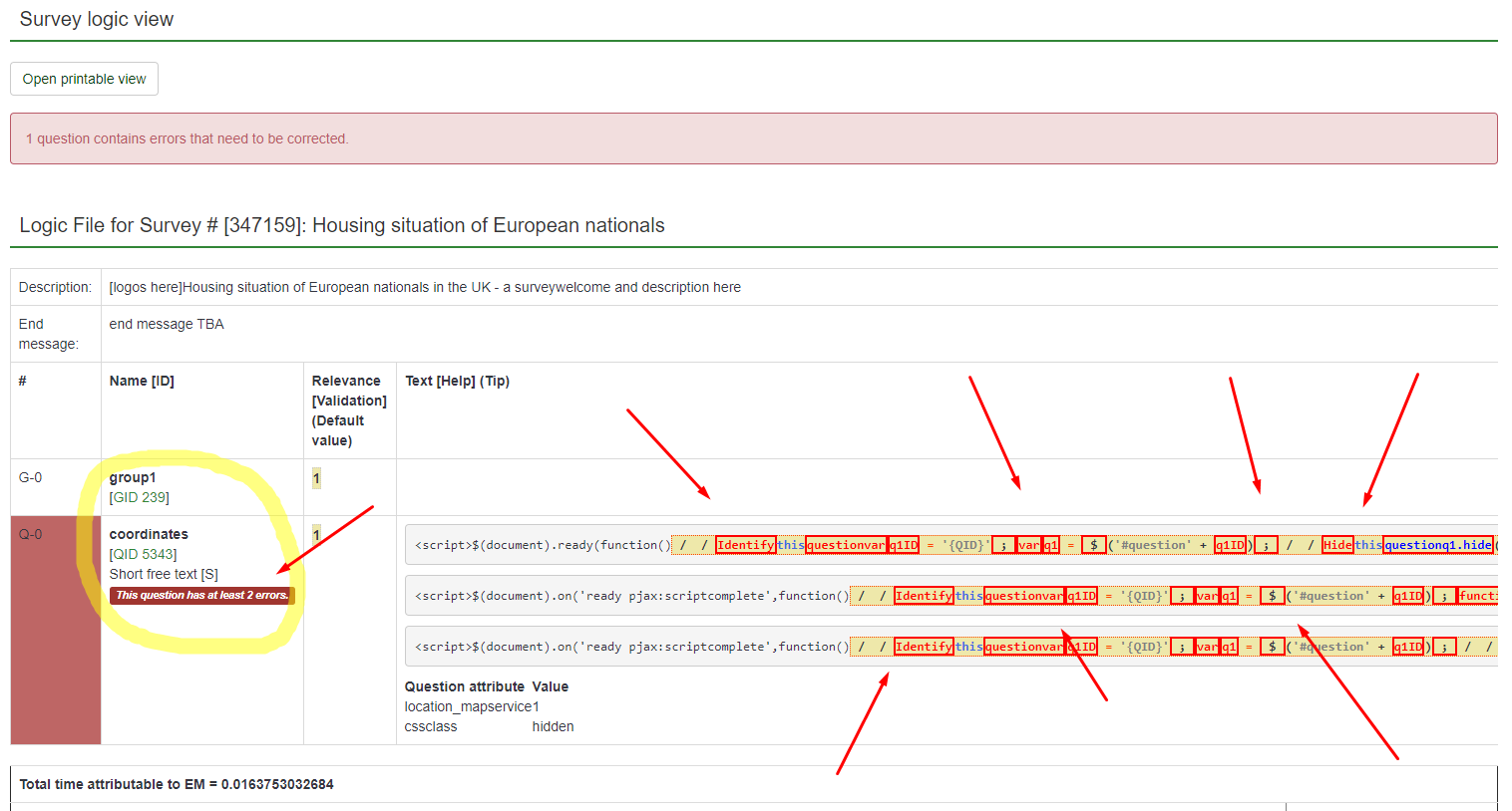 Thanks, I should have checked the survey logic file. I have copied a chunky bit of Javascript from the LS forum and pasted it into a txt file (actually an Excel unicode txt) that I subsequently imported into LS, but obviously LS did not like it. It works OK when I paste that script using the main LS interface.