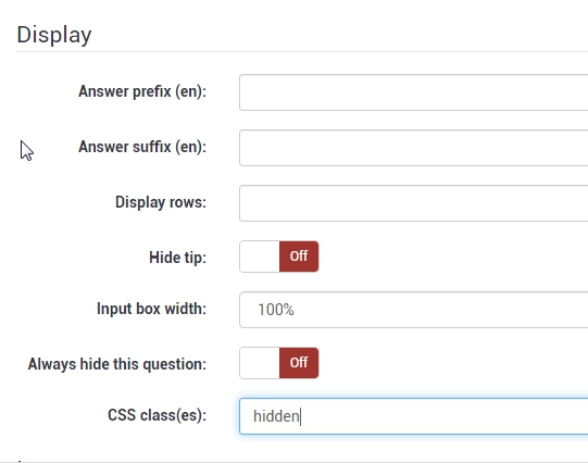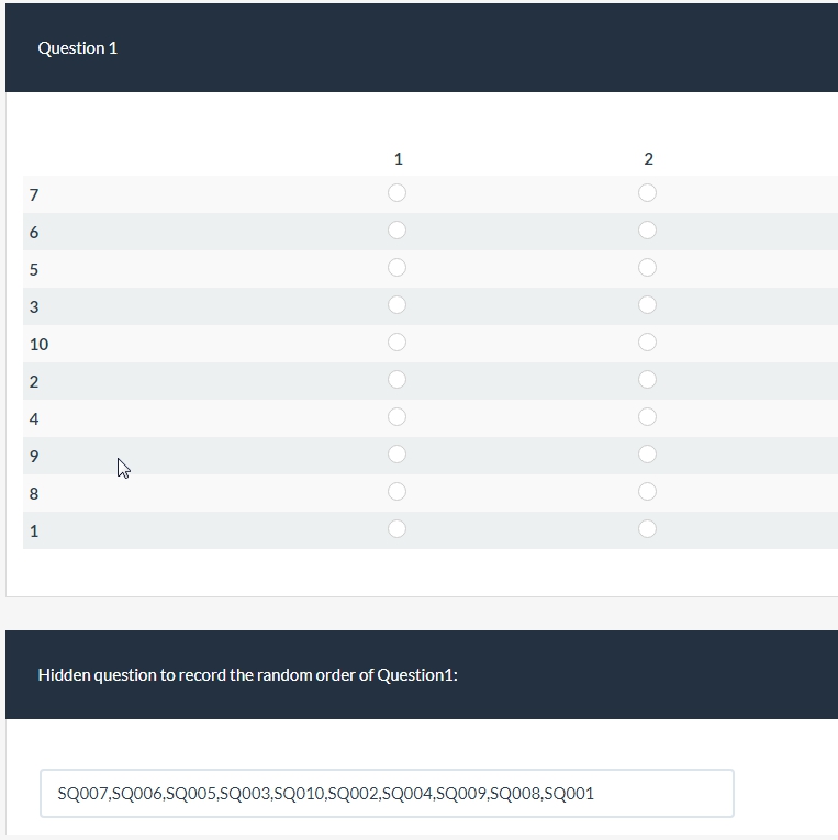 <script type="text/javascript" charset="utf-8"> $(document).on('ready pjax:scriptcomplete',function(){ //Identify the questions var thisQuestion = $('#question{QID}'); var hiddenQuestion = $(thisQuestion).nextAll('.text-short:eq(0)'); // Create an array of answer codes var answerCodes = []; $('tr.answers-list', thisQuestion).each(function(i) { answerCodes.push($(this).attr('id').split('X{QID}')[1]); }); // Load the hidden question $('input:text', hiddenQuestion).val(answerCodes); }); </script>