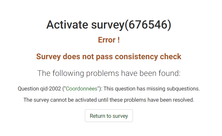 When trying to activate my latest survey, I'm getting an error message that it is not possible because the survey doesn't pass a consistency check, because one of the questions has missing subquestions (see screenshot in attachment).