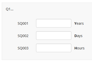 <script type="text/javascript" data-author="Tony Partner"> $(document).on('ready pjax:scriptcomplete',function(){ // Change the first suffix $('#question{QID} .suffix-text:eq(0)').html('<strong>Y</strong>ears'); // Change the second suffix $('#question{QID} .suffix-text:eq(1)').html('<strong>D</strong>ays'); // Change the third suffix $('#question{QID} .suffix-text:eq(2)').html('<strong>H</strong>ours'); }); </script>