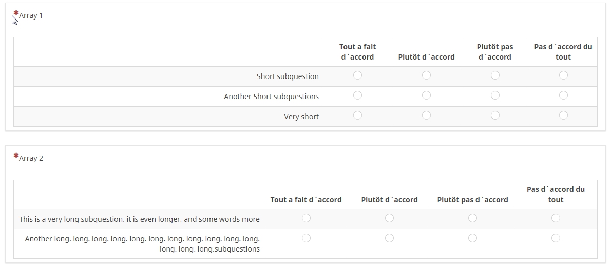 Setting the subquestion width to (let`s say) 40% and 4 answer options you get different displays of the answer option width?1. with the same width of the sub-questions the columns of the "answer options" are not the same.