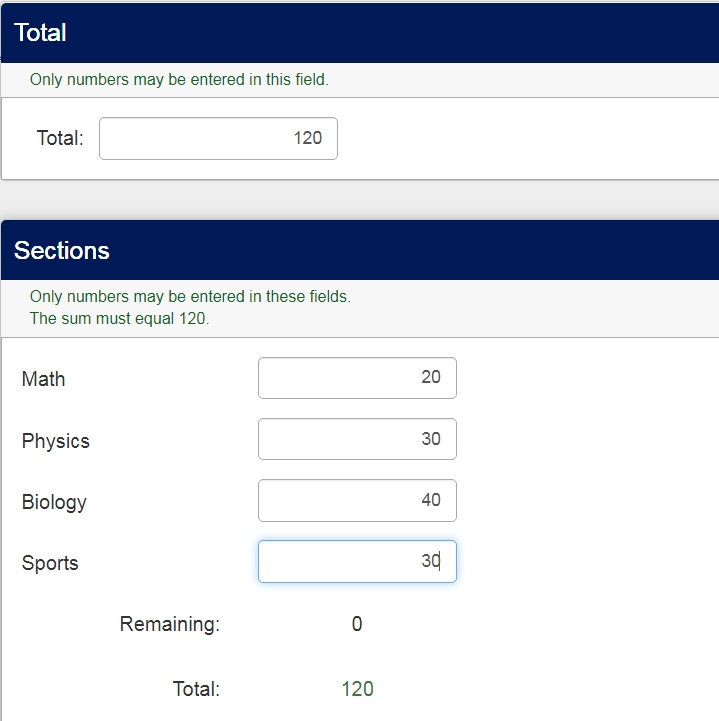 - Then (Q18b) divide the number of minutes in different categories (like presentation of a notion etc.). The question is an array of text with the option "Only numbers" and the total on the columns is presented. The array had 8 sub-questions (from SQ001 to SQ008) and the column for entering the numbers is named "total".