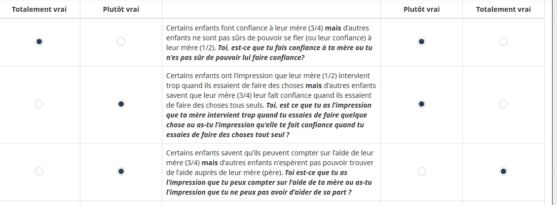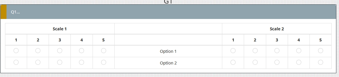 I would like to create a "array dual scale" question and positioned the sub-questions in the middle of the answer options. In the array I want to create, I have 4 options of answer so 2 of them would be on one side of the question and the other 2 on the other side. It should look like the picture below.