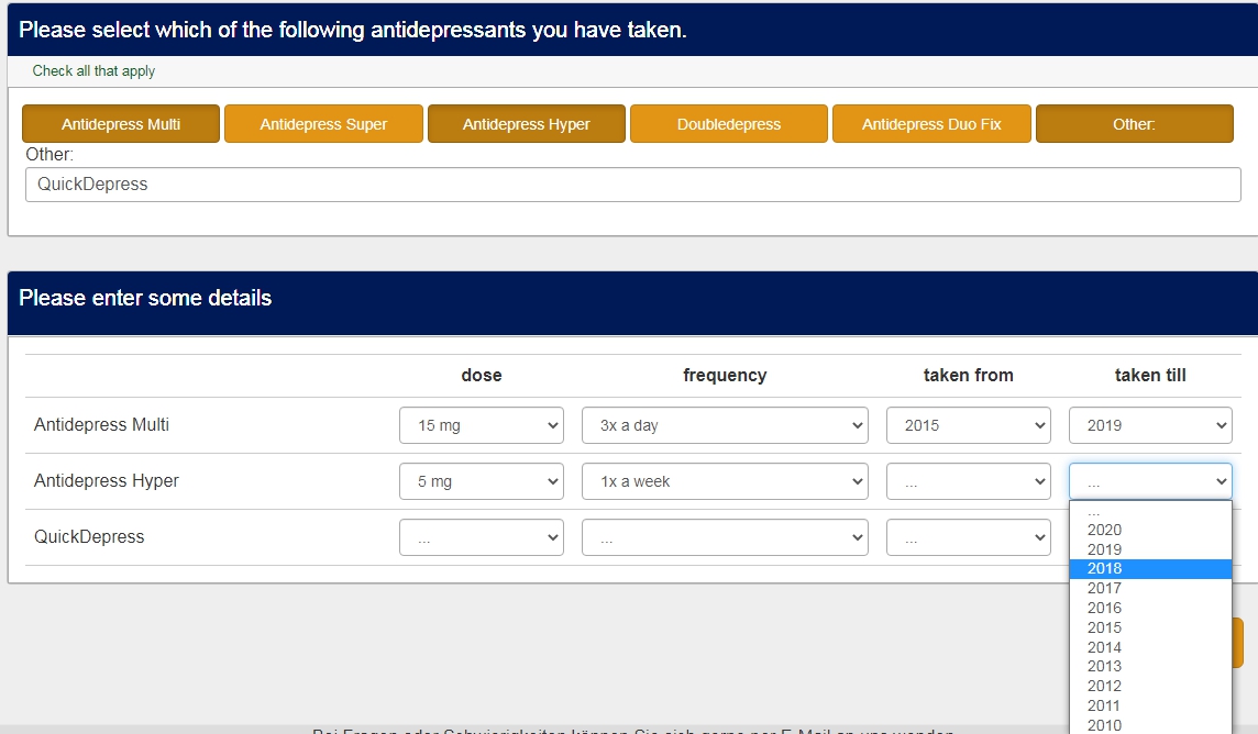 I guess it is much easier for participants to adhere to the structure above, if there are three comment boxes/fields, one for the name (citalopram), one for the dose (1x 20mg daily) and one for the period of time (2017-2019).