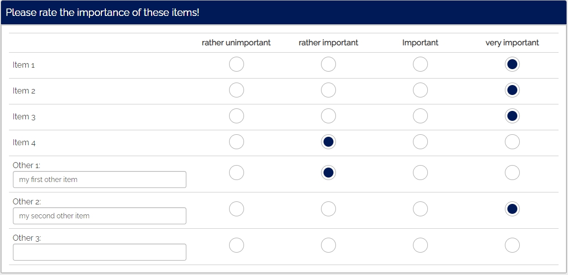 (1) Matrix with multiple questions and each question can be assessed by "rather unimportant"; "rather important"; "Important"; "very important".