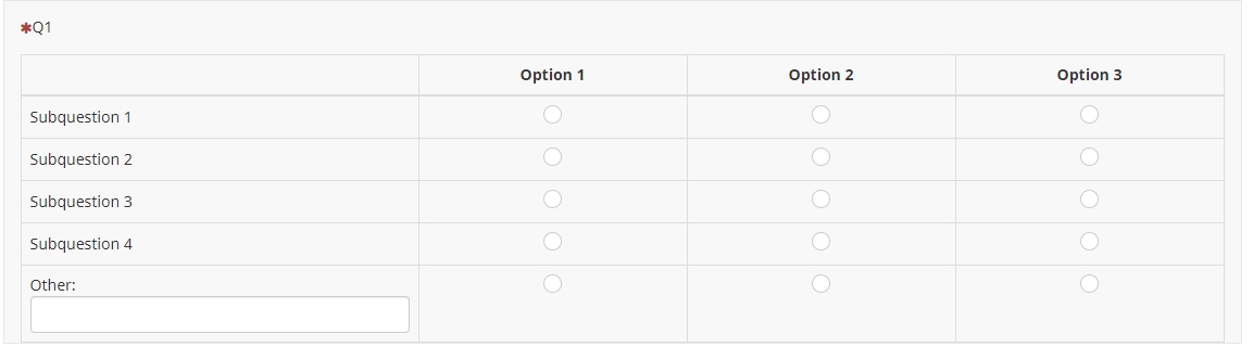 <script type="text/javascript" charset="utf-8"> $(document).ready(function() { // Identify the questions var thisQuestion = $('#question'+{QID}+''); var nextQuestion1 = $(thisQuestion).nextAll('.text-short:eq(0)'); var nextQuestions = $(nextQuestion1); var nextLength = nextQuestions.length; var sqLength = ('tr.answers-list', thisQuestion).length; // Hide the short-text questions $(nextQuestions).hide(); // Move the hidden text inputs into the array for (i = 0; i < nextLength; i++) { var workingIndex = (sqLength - 1) - (nextLength - i); var nextQ = nextQuestions[i]; $('th.answertext:eq('+workingIndex+')', thisQuestion).append($('input[type="text"]', nextQ)).closest('tr').addClass('otherRow'); } // Some styling... $('input[type="text"]', thisQuestion).css({ 'width': '100%' }); }); </script>