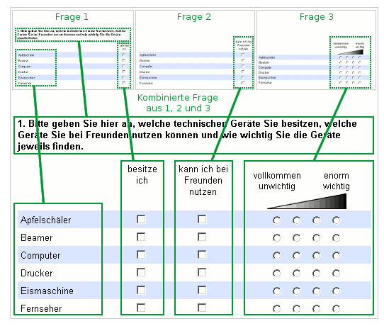 <script type="text/javascript" charset="utf-8"> // A JQuery plugin to insert comments into a specified column of a normal radio array VERSION 1 (function( $ ){ $.fn.cbArrayComments3 = function(options) { var opts = $.extend( { column: -1 // Text Input column (-1 will default to last column) }, options); return this.each(function() { // Identify the questions var thisQuestion = $(this); var q1ID = $(thisQuestion).attr('id').replace(/question/, ''); var thisQuestion = $('#question'+q1ID); var nextQuestion = thisQuestion.nextAll('.multiple-short-txt:eq(0)'); var q2ID = $(nextQuestion).attr('id').replace(/question/, ''); //Hide the multiple-short-text nextQuestion.hide(); // Move the text inputs var column = $('tr.answers-list:eq(0) td.answer-item', thisQuestion).length; if(opts.column > 0) { column = opts.column; } $('tr.answers-list', thisQuestion).each(function(i) { var thisCode = $(this).attr('id').split('X')[2].split(q1ID)[1]; $('td.answer-item:eq('+(column-1)+') input[type="radio"]', this).css({ 'position': 'absolute', 'left': '-9999em' }); $('td.answer-item:eq('+(column-1)+')', this).removeClass('radio-item').addClass('inserted-text-item').append($('input[type="text"][id$="X'+q2ID+thisCode+'"]', nextQuestion)); }); }); }; })( jQuery ); $(document).on('ready pjax:scriptcomplete',function(){ var thisQuestion = $('#question{QID}'); // Add a question class thisQuestion.addClass('custom-array'); // Column-specific classes $('table.subquestion-list tr', thisQuestion).each(function(i) { $('th, td', this).each(function(i) { $(this).addClass('column-'+i); }); }); $('#question{QID}').cbArrayComments3({ column: 7 // Text Input column (-1 will default to last column) }); }); </script>