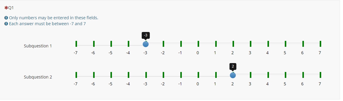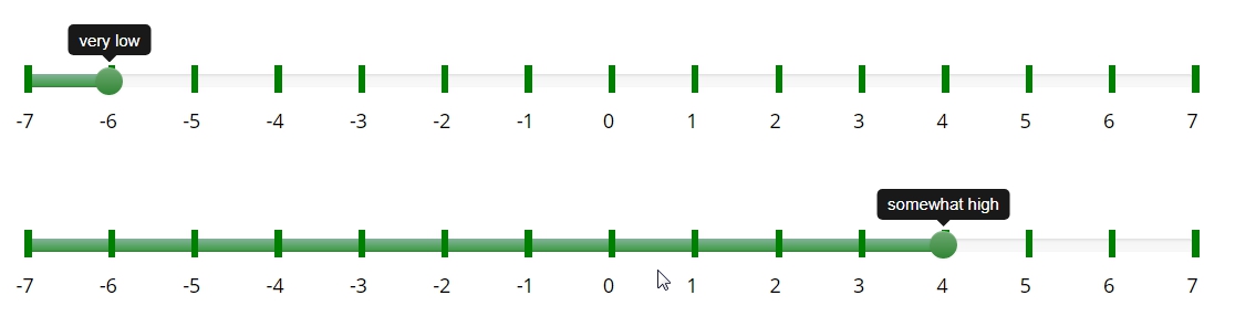 <script type="text/javascript" charset="utf-8"> $(document).on('ready pjax:scriptcomplete',function(){ // Identify this question var thisQuestion = $('#question{QID}'); // Define the text strings var tipTexts = { -7: '-7', -6: '-6', -5: '-5', -4: '-4', -3: '-3', -2: '-2', -1: '-1', 0: '0', 1: '1', 2: '2', 3: '3', 4: '4', 5: '5', 6: '6', 7: '7' }; $('input:text', thisQuestion).on('slideEnabled',function(){ var thisItem = $(this).closest('li'); // Insert custom tooltip $('.tooltip-inner', thisItem).addClass('tooltip-inner-1 hidden'); $('.tooltip', thisItem).append('<div class="tooltip-inner tooltip-inner-2">'+tipTexts[$(this).val()]+'</div>'); // Listener on slider $(this).on('slide slideStop', function(event) { // Handle dynamic tooltip text $('.tooltip-inner-2', thisItem).text(tipTexts[$(this).val()]); }); }); }); </script><script type="text/javascript" charset="utf-8"> $(document).on('ready pjax:scriptcomplete',function(){ var ticksArray = [ [-7, '-7'], [-6, '-6'], [-5, '-5'], [-4, '-4'], [-3, '-3'], [-2, '-2'], [-1, '-1'], [0, '0'], [1, '1'], [2, '2'], [3, '3'], [4, '4'], [5, '5'], [6, '6'], [7, '7'], ]; insertSliderTicks('{QID}', ticksArray); }); /* Insert Slider Tick Marks */ function insertSliderTicks(qID, ticksArray) { var thisQuestion = $('#question'+qID); $(thisQuestion).addClass('with-inserted-ticks'); $('input:text', thisQuestion).on('slideEnabled',function(){ var thisSlider = $(this); var thisItem = $(thisSlider).closest('li'); var thisMin = $('.slider-handle:eq(0)', thisItem).attr('aria-valuemin'); var thisMax = $('.slider-handle:eq(0)', thisItem).attr('aria-valuemax'); var thisRange = thisMax - thisMin; $.each(ticksArray, function(i, val) { var tickRelativePosition = val[0] - thisMin; var tickPercent = (tickRelativePosition/thisRange)*100; // Insert tick marks $('.slider-handle:eq(0)', thisItem).before('<div class="inserted-tick left-'+tickPercent+'" style="left: '+tickPercent+'%">\ <div class="tick-text">'+val[1]+'</div>\ </div>'); }); }); } </script> <style type="text/css">/* Slider Tick Marks */ @media only screen and (min-width: 768px) { .with-inserted-ticks .slider-container { padding-right: 50px; padding-left: 50px; } } .with-inserted-ticks .slider-item { margin-bottom: 50px; } .with-inserted-ticks .slider-container .help-block { margin: 25px 0 0 -20px; width: 40px; text-align: center; } .with-inserted-ticks .slider-container .help-block.pull-right { margin: 25px -20px 0 0; } .inserted-tick { position: absolute; top: 20%; height: 20px; width: 5px; margin-top: -5px; margin-left: -1px; background-color: #DDDDDD; background-color: green; } .inserted-tick.left-0, .inserted-tick.left-100 { background-color: transparent; background-color: green; } .inserted-tick .tick-text { position: absolute; top: 150%; width: 100px; margin-left: -50px; color: #000000; text-align: center; } @media only screen and (max-width: 768px) { .inserted-tick.left-0 .tick-text { margin-left: 0px; text-align: left; } .inserted-tick.left-100 .tick-text { margin-left: -100px; text-align: right; } } </style>