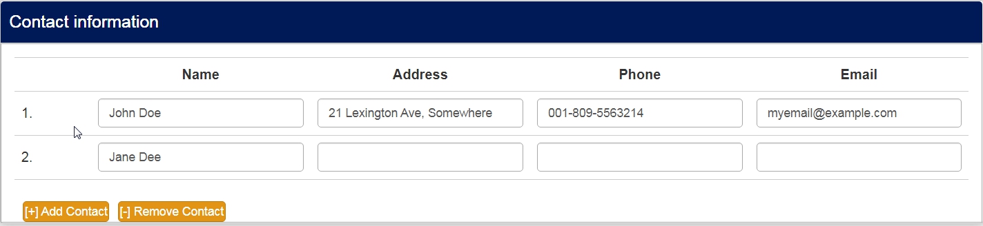 <script> $(document).ready(function() { // A function to add or remove rows of an Array (Multi Flexible)(Text) question function varLengthArray(qID) { if ($('#question'+qID+'').length > 0) { // The HTML content of the Add/Remove elements - modify as you wish var addContent = '[+] Add Contact'; var removeContent = '[-] Remove Contact'; // Create the Add and Remove elements & insert them var el1 = document.createElement('div'); el1.setAttribute('id','addButton'+qID); el1.setAttribute('class','btn btn-primary'); document.body.appendChild(el1); var el2 = document.createElement('div'); el2.setAttribute('id','removeButton'+qID); el2.setAttribute('class','btn btn-primary'); document.body.appendChild(el2); // Move them to after the array $( 'div#addButton'+qID ).appendTo($( '#question' + qID + ' table.ls-answers' ).parent()); $( 'div#removeButton'+qID ).appendTo($( '#question' + qID + ' table.ls-answers' ).parent()); // Insert their HTML $( 'div#addButton'+qID ).html( addContent ); $( 'div#removeButton'+qID ).html( removeContent ); // Style the elements - you can modify here if you wish $( 'div#addButton'+qID ).css({ 'margin':'10px 0 0 10px', 'padding':'1px', 'text-align':'center', 'width':'auto', 'cursor':'pointer', 'float':'left' }); $( 'div#removeButton'+qID ).css({ 'margin':'10px 0 0 10px', 'padding':'1px', 'text-align':'center', 'width':'auto', 'cursor':'pointer', 'float':'left' }); // Initially hide the Remove element $( 'div#removeButton'+qID ).hide(); // Call the functions below when clicked $( 'div#addButton'+qID ).click(function (event) { addRow(qID); }); $( 'div#removeButton'+qID ).click(function (event) { removeRow(qID); }); // Function to add a row, also shows the Remove element and hides the //Add element if all rows are shown function addRow(qID) { var arrayRow = '#question' + qID + ' table.ls-answers tr.subquestion-list'; var rowCount = $( arrayRow ).size() - 1; $( arrayRow + '[name="hidden"]:first' ).attr('name', 'visible').show(); $( 'div#removeButton'+qID ).show(); if ( $( arrayRow + ':eq(' + rowCount + ')' ).attr('name') == 'visible' ) { $( 'div#addButton'+qID ).hide(); } } // Function to remove a row, also clears the contents of the removed row, // shows the Add element if the last row is hidden and hides the Remove // element if only the first row is shown function removeRow(qID) { var arrayRow = '#question' + qID + ' table.ls-answers tr.subquestion-list'; var rowCount = $( arrayRow ).size() - 1; $( arrayRow + '[name="visible"]:last input[type="text"]' ).val(''); $( arrayRow + '[name="visible"]:last' ).attr('name', 'hidden').hide(); $( 'div#addButton'+qID ).show(); if ( $( arrayRow + ':eq(1)' ).attr('name') == 'hidden' ) { $( 'div#removeButton'+qID ).hide(); } } // Just some initialization stuff var arrayRow = '#question' + qID + ' table.ls-answers tr.subquestion-list'; var rowCount = ''; // Initially hide all except first row or any rows with populated inputs $( arrayRow ).each(function(i) { if ( i > 0 ) { // We also need to give the hidden rows a name cause IE doesn't // recognize jQuery :visible selector consistently $( this ).attr('name', 'hidden').hide(); $('input[type=text]', this).each(function(i) { if ($(this).attr('value') != '') { $(this).parents('tbody:eq(0)').attr('name', 'visible').show(); $( 'div#removeButton'+qID ).show(); } }); rowCount = i; } }); } } // Call the function with a question ID varLengthArray({QID}); }); </script>