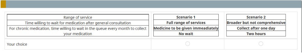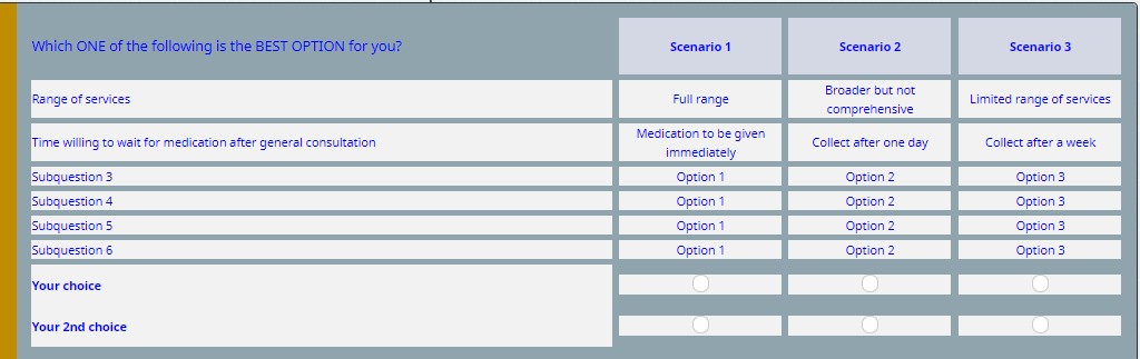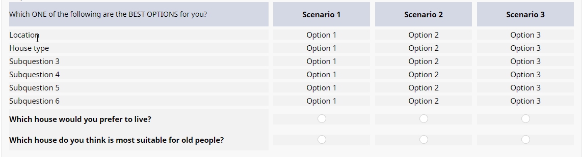 <table style="border:0;padding:0;border-collapse:collapse;color:#000;width:100%"> <thead> <tr> <td class="td1">Which of the following are the BEST OPTIONS for you? </td> <td class="tdf"> </td> <td class="tdn"><strong>Scenario 1</strong></td> <td class="tdf"> </td> <td class="tdn"><strong>Scenario 2</strong></td> <td class="tdf"> </td> <td class="tdn"><strong>Scenario 3</strong></td> </tr> </thead> <tbody> <tr style="height: 6px; text-align: center;"> </tr> <tr> <td class="td1">Location</td> <td class="tdf"> </td> <td class="tdn">Option 1</td> <td class="tdf"> </td> <td class="tdn">Option 2</td> <td class="tdf"> </td> <td class="tdn">Option 3</td> </tr> <tr style="height: 6px; text-align: center;"> </tr> <tr> <td class="td1">House type</td> <td class="tdf"> </td> <td class="tdn">Option 1</td> <td class="tdf"> </td> <td class="tdn">Option 2</td> <td class="tdf"> </td> <td class="tdn">Option 3</td> </tr> <tr style="height: 6px; text-align: center;"> </tr> <tr> <td class="td1">Subquestion 3</td> <td class="tdf"> </td> <td class="tdn">Option 1</td> <td class="tdf"> </td> <td class="tdn">Option 2</td> <td class="tdf"> </td> <td class="tdn">Option 3</td> </tr> <tr style="height: 6px; text-align: center;"> </tr> <tr> <td class="td1">Subquestion 4</td> <td class="tdf"> </td> <td class="tdn">Option 1</td> <td class="tdf"> </td> <td class="tdn">Option 2</td> <td class="tdf"> </td> <td class="tdn">Option 3</td> </tr> <tr style="height: 6px; text-align: center;"> </tr> <tr> <td class="td1">Subquestion 5</td> <td class="tdf"> </td> <td class="tdn">Option 1</td> <td class="tdf"> </td> <td class="tdn">Option 2</td> <td class="tdf"> </td> <td class="tdn">Option 3</td> </tr> <tr style="height: 6px; text-align: center;"> </tr> <tr> <td class="td1">Subquestion 6</td> <td class="tdf"> </td> <td class="tdn">Option 1</td> <td class="tdf"> </td> <td class="tdn">Option 2</td> <td class="tdf"> </td> <td class="tdn">Option 3</td> </tr> <tr style="height: 6px; text-align: center;"> </tr> <tr> <td class="td1"><strong>Which house would you prefer to live?</strong></td> <td class="tdf"> </td> <td class="tdn"> </td> <td class="tdf"> </td> <td class="tdn"> </td> <td class="tdf"> </td> <td class="tdn"> </td> </tr> <tr> <td class="td1"><strong>Which house do you think is most suitable for old people?</strong></td> <td class="tdf"> </td> <td class="tdn"> </td> <td class="tdf"> </td> <td class="tdn"> </td> <td class="tdf"> </td> <td class="tdn"> </td> </tr> </tbody> </table>
