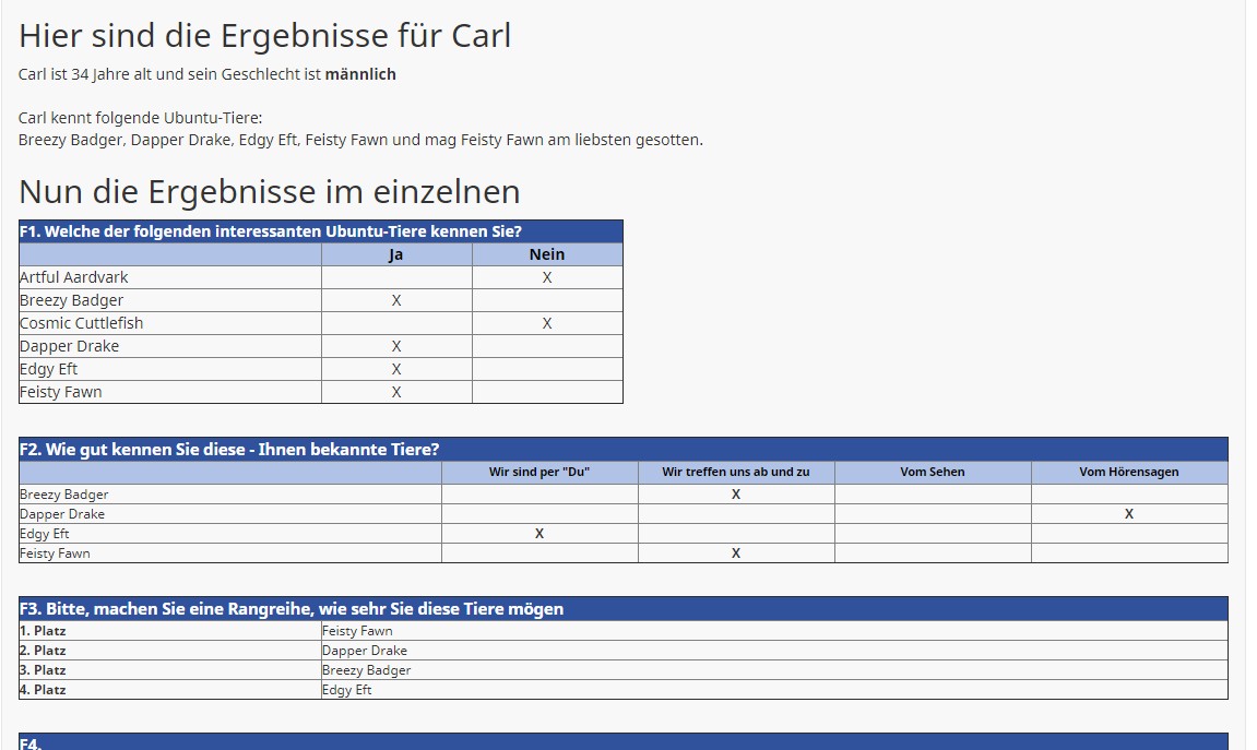 <h2>Hier sind die Ergebnisse für {F6a}</h2> {F6a} ist {F6b} Jahre alt und sein Geschlecht ist <strong>{if(F6c==1,"männlich","weiblich")}</strong><br /> <br /> {F6a} kennt folgende Ubuntu-Tiere:<br /> {list(that.F1.shown)} und mag {F3_1.shown} am liebsten {F4.shown}. <h2>Nun die Ergebnisse im einzelnen</h2> <table border="1" collapse="collapse" width="50%"> <thead> <tr> <th class="frage" colspan="3" style="background-color:#30529d;color:white;">F1. Welche der folgenden interessanten Ubuntu-Tiere kennen Sie?</th> </tr> </thead> <thead> <tr> <th class="tdueberq sp6" style="background-color: #B1C2E7;color:black;text-align:left;width:50%"> </th> <th class="tduebera sp3" style="background-color: #B1C2E7;color:black;text-align:center;width:25%" valign="middle">Ja</th> <th class="tduebera sp3" style="background-color: #B1C2E7;color:black;text-align:center;width:25%" valign="middle">Nein</th> </tr> </thead> <tbody> <tr> <td class="tdquestion" style="text-align:left;width:50%">{F1_SQ001.question}</td> <td class="tdanswer" style="text-align:center;width:25%">{if(F1_SQ001=="Y","X","")}</td> <td class="tdanswer" style="text-align:center;width:25%">{if(F1_SQ001!="Y","X","")}</td> </tr> ---